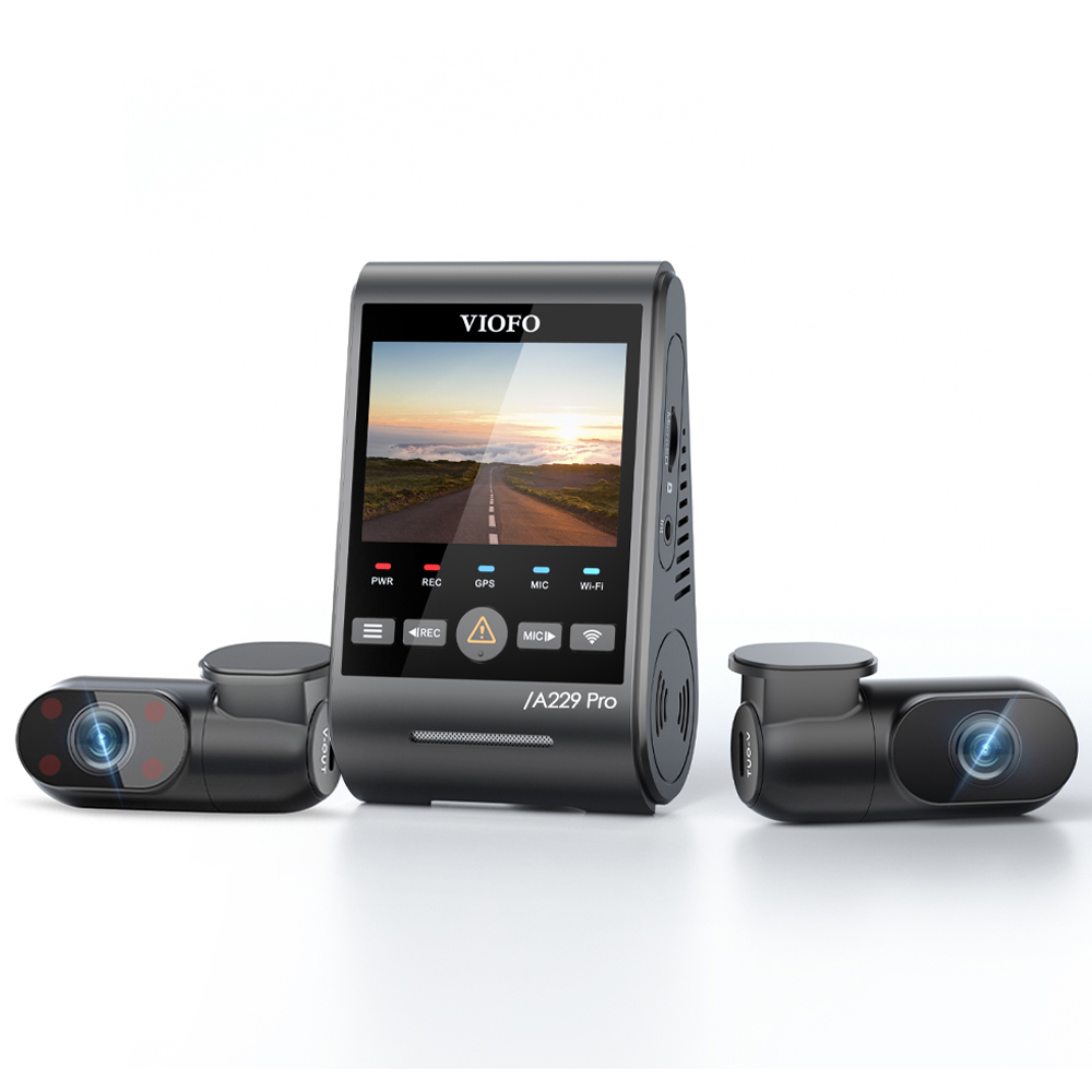 VIOFO A229 PRO posiada dyskretny główny moduł z wyświetlaczem, który pełni jednocześnie funkcję przedniej kamery. W module mamy wbudowany GPS oraz WIFI działające na pasmach 2.4Ghz oraz 5Ghz. Do głównej części zestawu wpinamy dodatkowo kamerę do wnętrza wyposażoną w diody IR oraz kamerę na tył.
