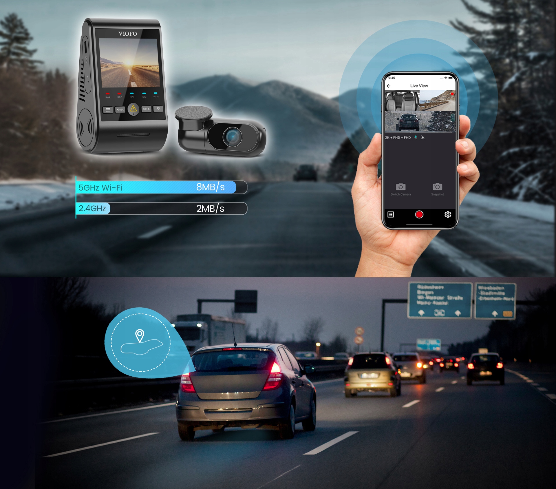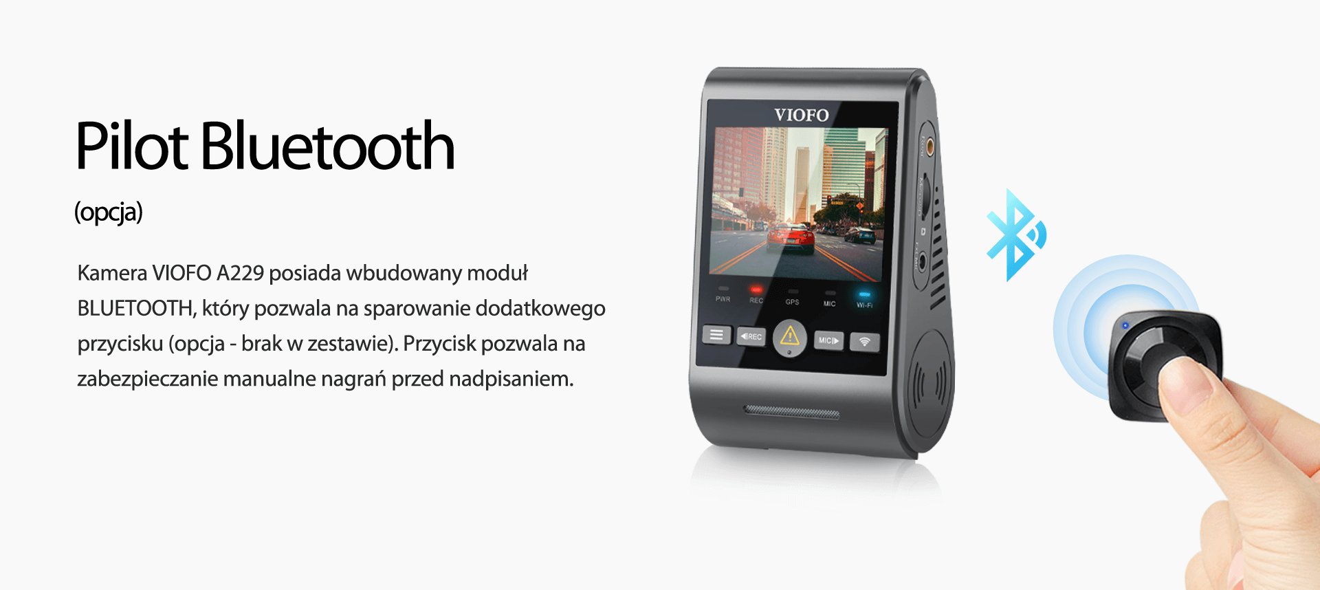 VIOFO A229 DUO-G ma wbudowany zaawansowany moduł WIFI pracujący w paśmie 2.4Ghz oraz 5Ghz. Sterowania kamery może być realizowane np. ze smartfona dzięki darmowej aplikacji iOS/Android o nazwie VIOFO. Dodatkowo kamera posiada moduł BLUETOOTH, do którego będzie można sparować przycisk "zabezpiecz nagranie".