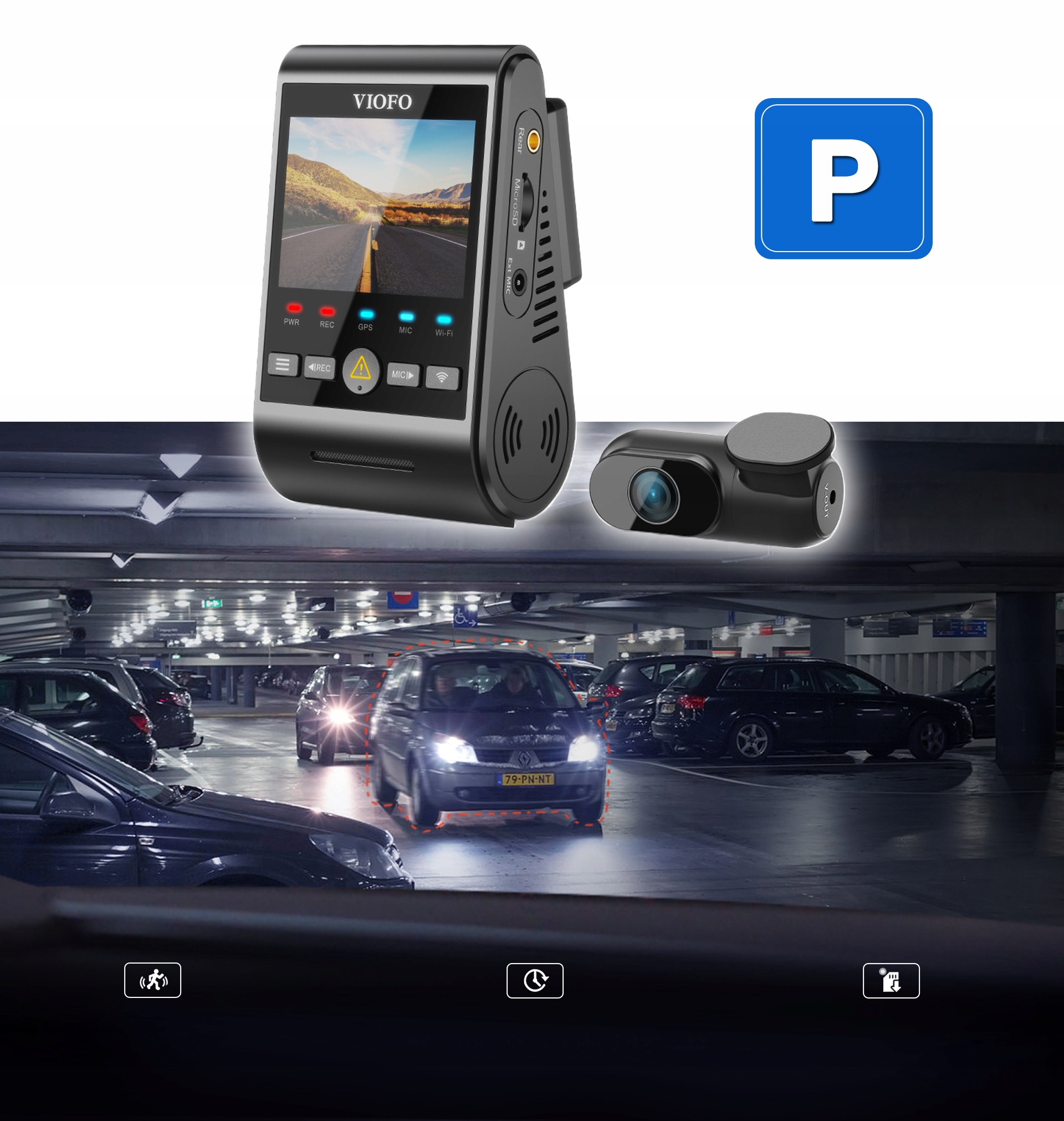 Model VIOFO A229 DUO-G został wyposażony w inteligentny, buforowany tryb parkingowy. Aby z niego korzystać, zaleca się podłączenie kamery do instalacji elektrycznej pojazdu za pomocą adaptera VIOFO HK4. System ten automatycznie przełącza się między trybem jazdy a monitorowaniem postoju.