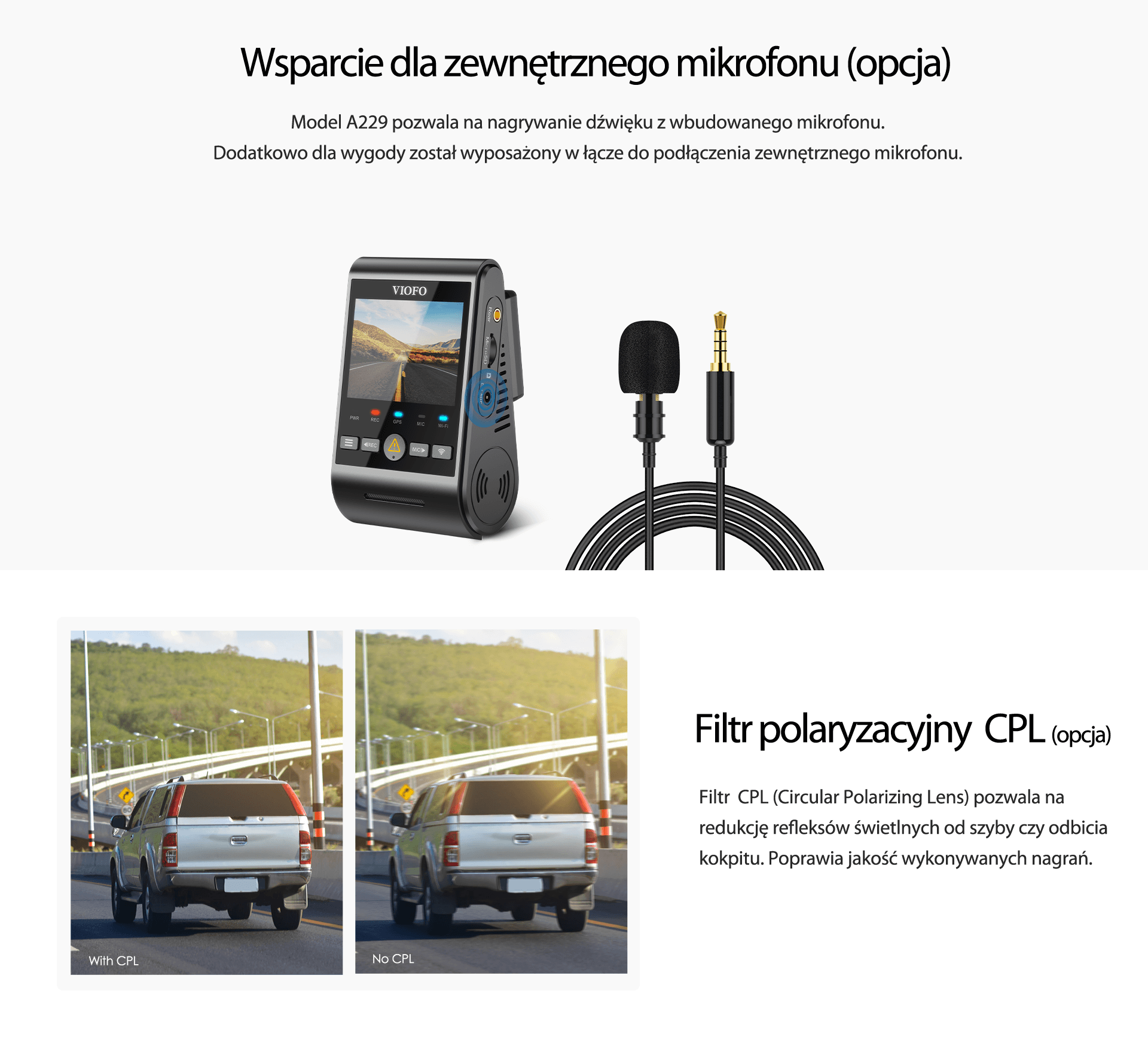 Zewnętrzny mikrofon: Jako jeden z nielicznych modeli, A229 oferuje gniazdo na opcjonalny zewnętrzny mikrofon. To idealne rozwiązanie dla osób prowadzących VLOG-i z podróży lub chcących nagrywać dźwięk z konkretnego miejsca w aucie.