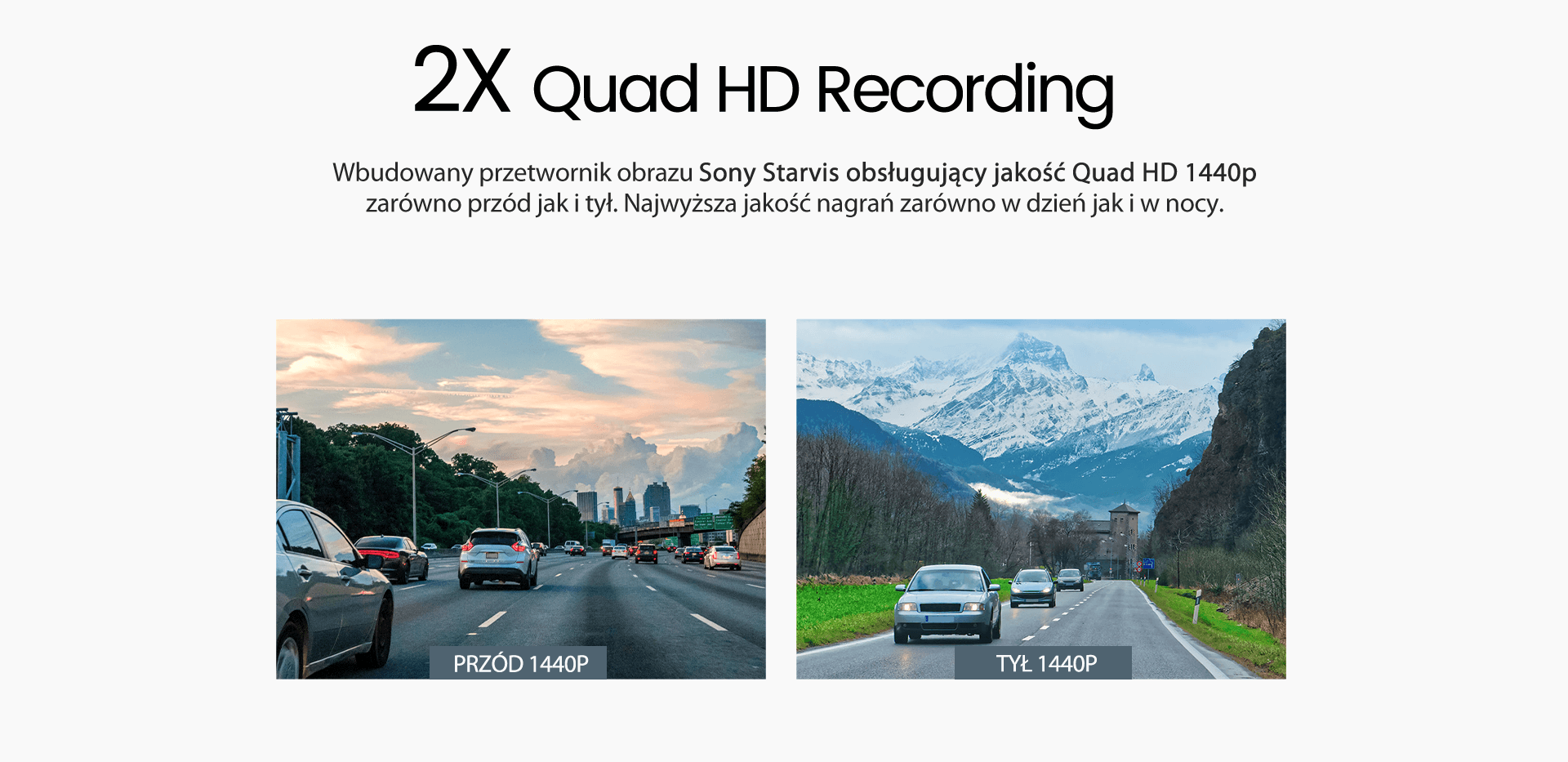 Niespotykane dotąd rozwiązanie- jedna z pierwszych kamer samochodowych na świecie pozwalająca nagrywać zarówno przód jak i tył w jakości 2K. Najwyższa rozdzielczość przód i tył 2560x1440P 30fps + 2560x1440P 30fps