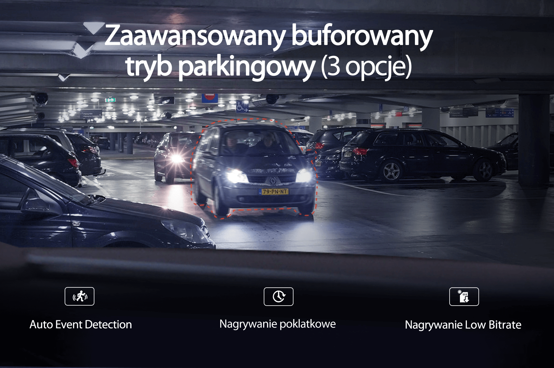 Funkcja buforowania pozwala na zapisanie zdarzenia wraz z momentem poprzedzającym incydent, co jest kluczowe przy ustalaniu sprawcy stłuczki. Kamera oferuje trzy opcje dozoru: detekcję ruchu i wstrząsu, nagrywanie poklatkowe (Time-lapse) oraz zapis z obniżonym bitrate. Tryb parkingowy chroni pojazd z obu stron, zabezpieczając go w 100 procentach podczas Twojej nieobecności.