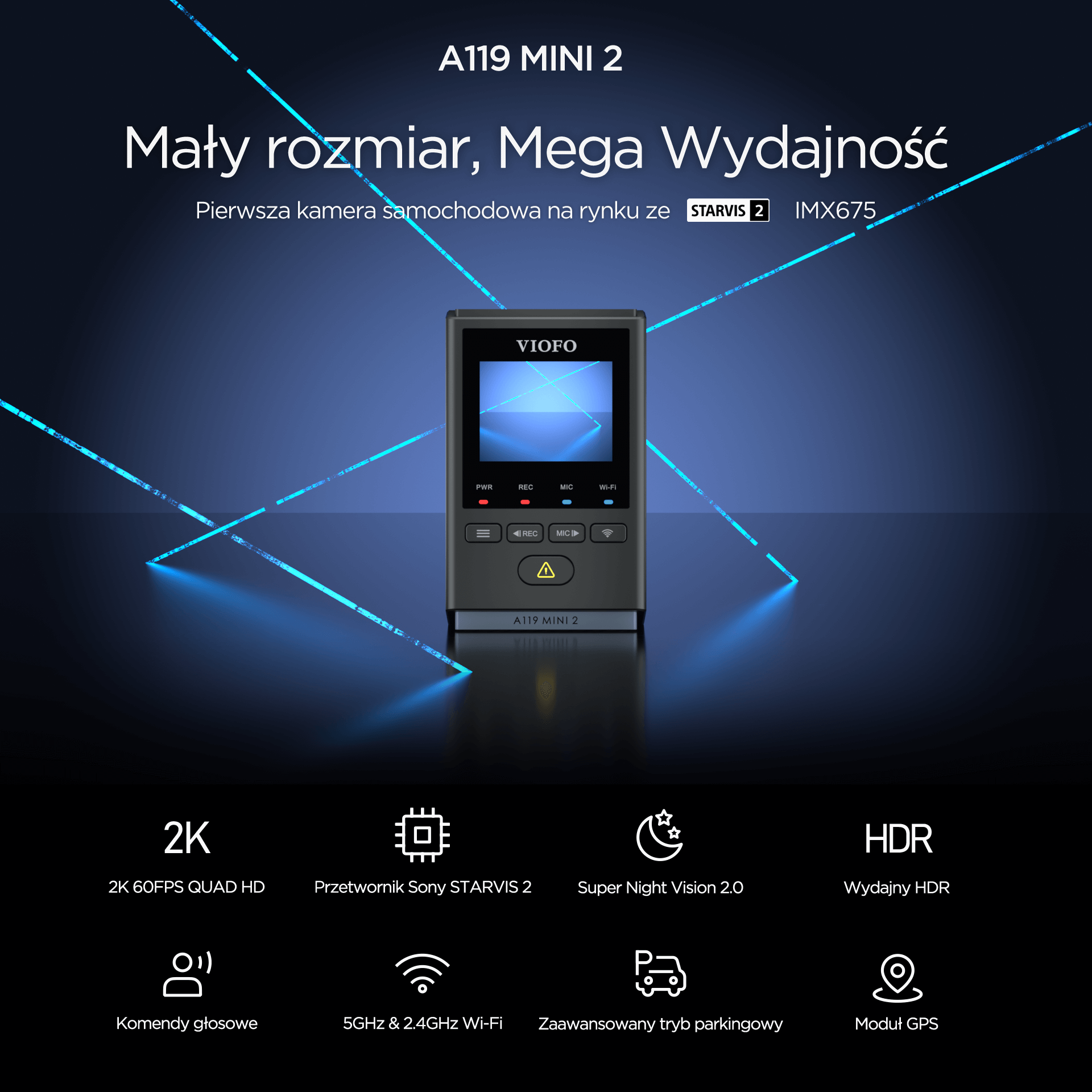 Viofo A119 Mini 2 to najnowsza odsłona kompaktowej kamery samochodowej, która łączy miniaturowe rozmiary z najwyższą jakością obrazu 2K. Dzięki zastosowaniu nowoczesnej matrycy Sony Starvis 2 IMX675, rejestrator zapewnia niespotykaną dotąd szczegółowość nagrań nocnych z technologią HDR. Urządzenie oferuje pełną funkcjonalność, w tym dwupasmowe WiFi, moduł GPS oraz innowacyjne sterowanie głosowe w języku angielskim, zapewniając bezpieczeństwo i komfort każdemu kierowcy bez zasłaniania widoku przez przednią szybę.