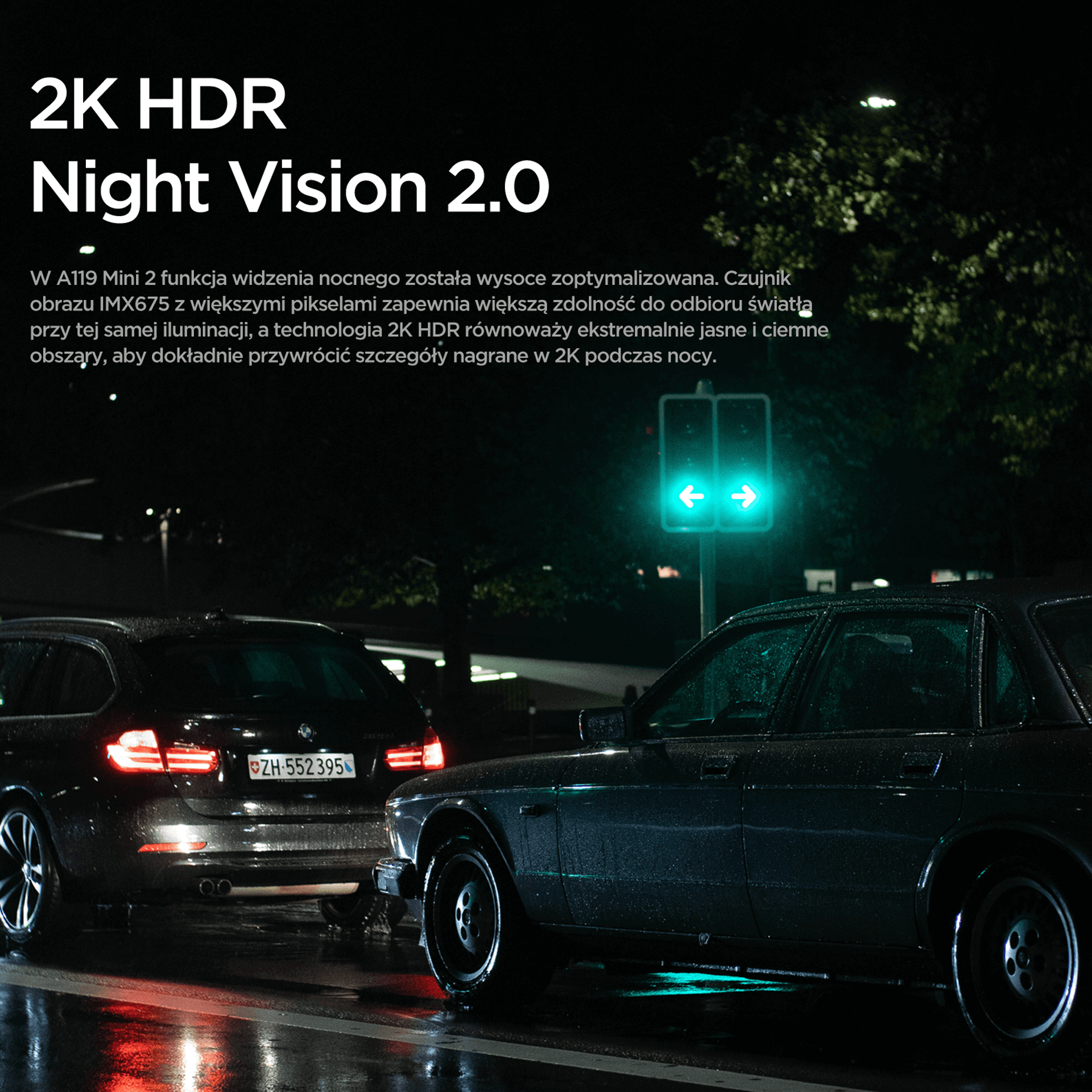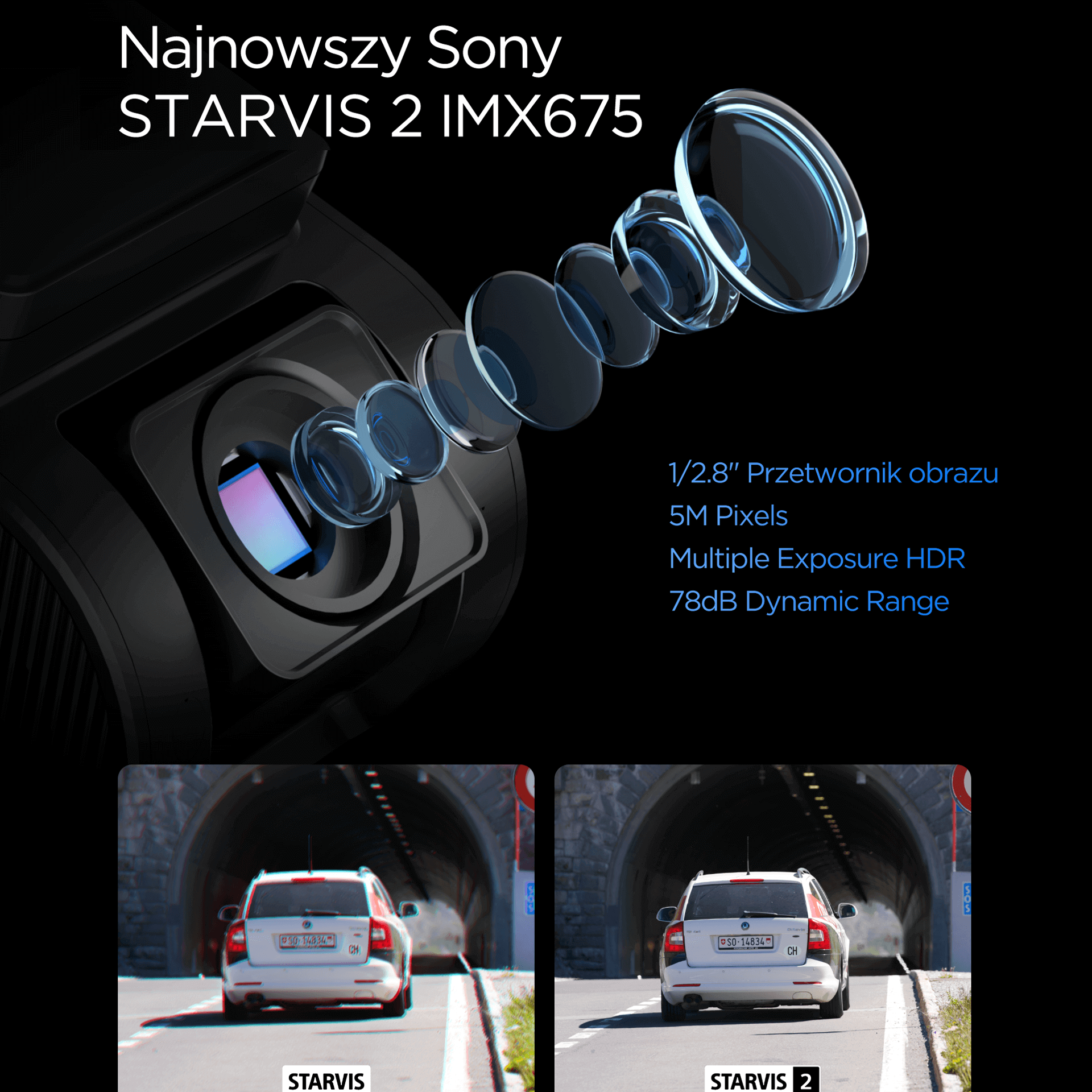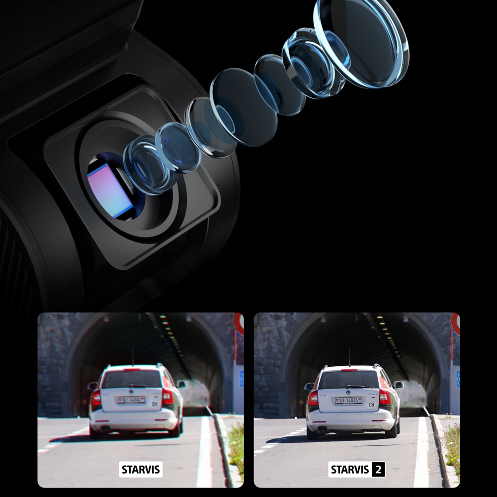 Kamera samochodowa wyposażona w matrycę SONY STARVIS 2 IMX675 i obiektyw o jasności F1.6 140°- takie rozwiązanie pozwala na doskonała jakość nagrywania w dzień i w nocy.