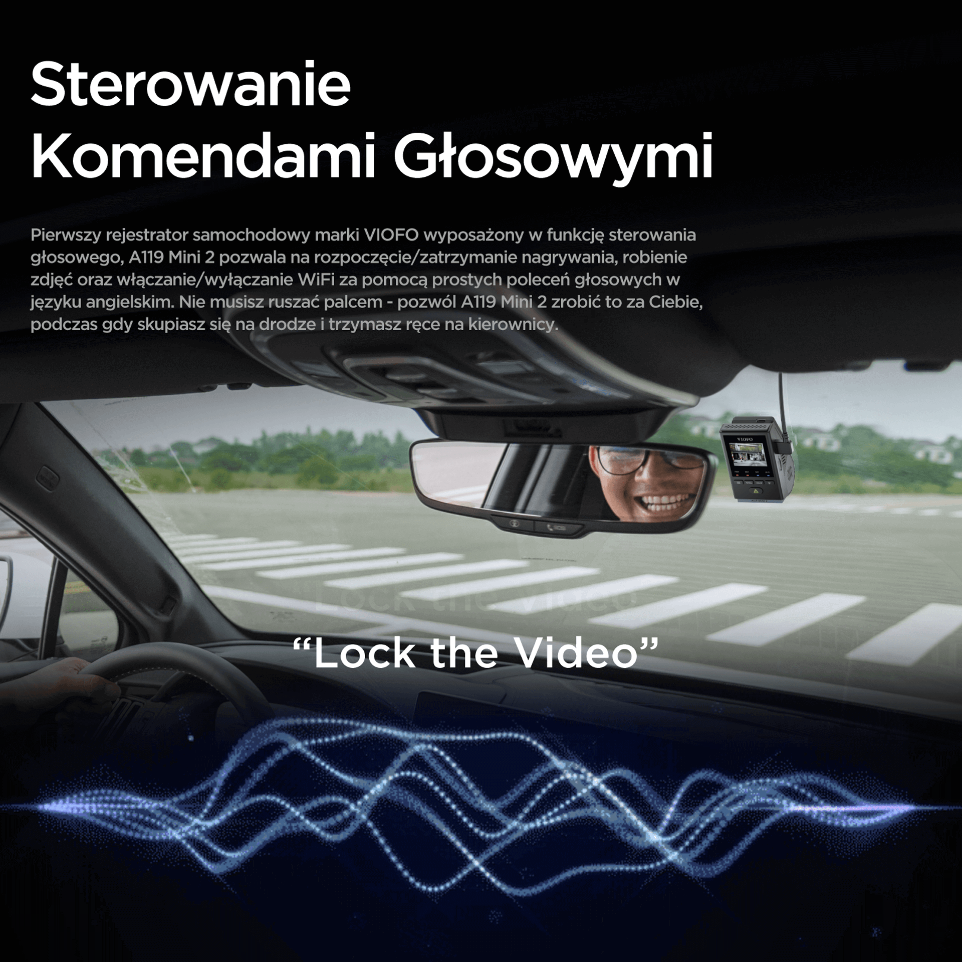To pierwszy rejestrator marki Viofo, który umożliwia obsługę za pomocą prostych komend głosowych w języku angielskim. Możesz głosowo nakazać urządzeniu wykonanie zdjęcia, włączenie WiFi czy zabezpieczenie aktualnego nagrania. Dodatkowo kamera komunikuje się z kierowcą w języku polskim, informując o rozpoczęciu nagrywania czy błędach karty pamięci.