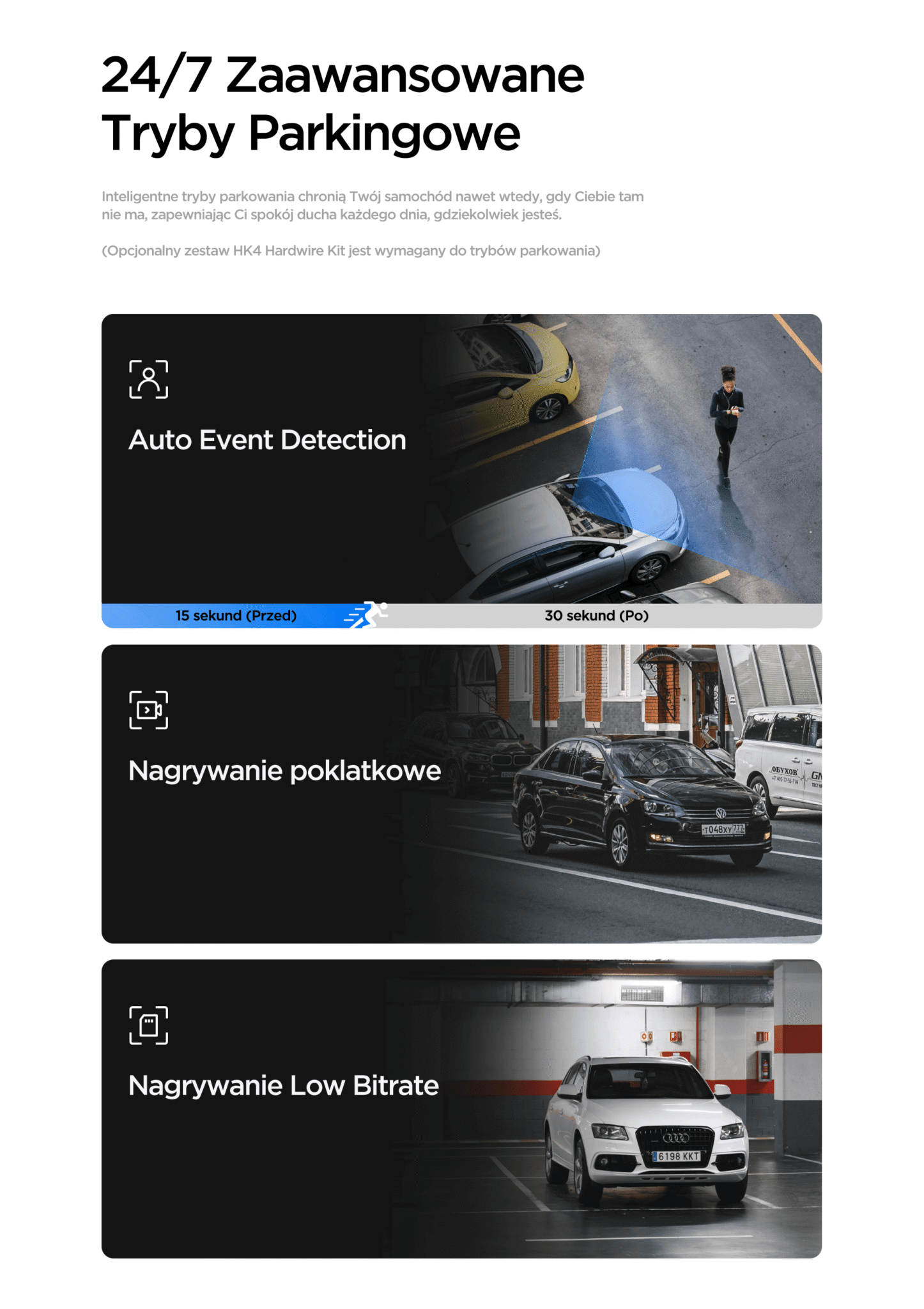 Tak, kamera posiada zaawansowany tryb parkingowy (w tym tryb buforowany, który zapisuje kilkanaście sekund przed zdarzeniem). Aby jednak tryb parkingowy działał prawidłowo i nie rozładował akumulatora w Twoim samochodzie, konieczne jest dokupienie i podłączenie adaptera zasilania (tzw. Hardwire Kit). Podpina się go bezpośrednio do skrzynki bezpieczników.