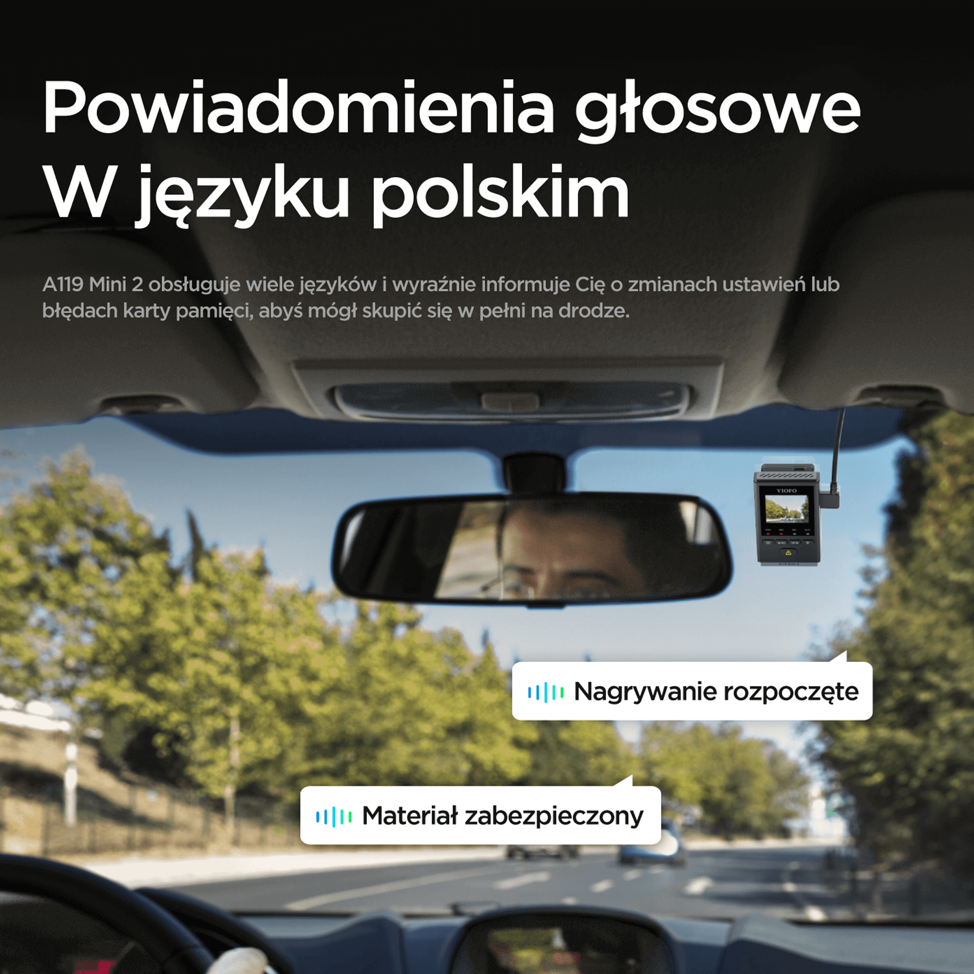 Kamera Viofo A119 MINI 2 posiada wyświetlacz 1.5" oraz dodatkowo sygnalizuje status swojej pracy za pomocą komunikatów głosowych w języku polskim.
