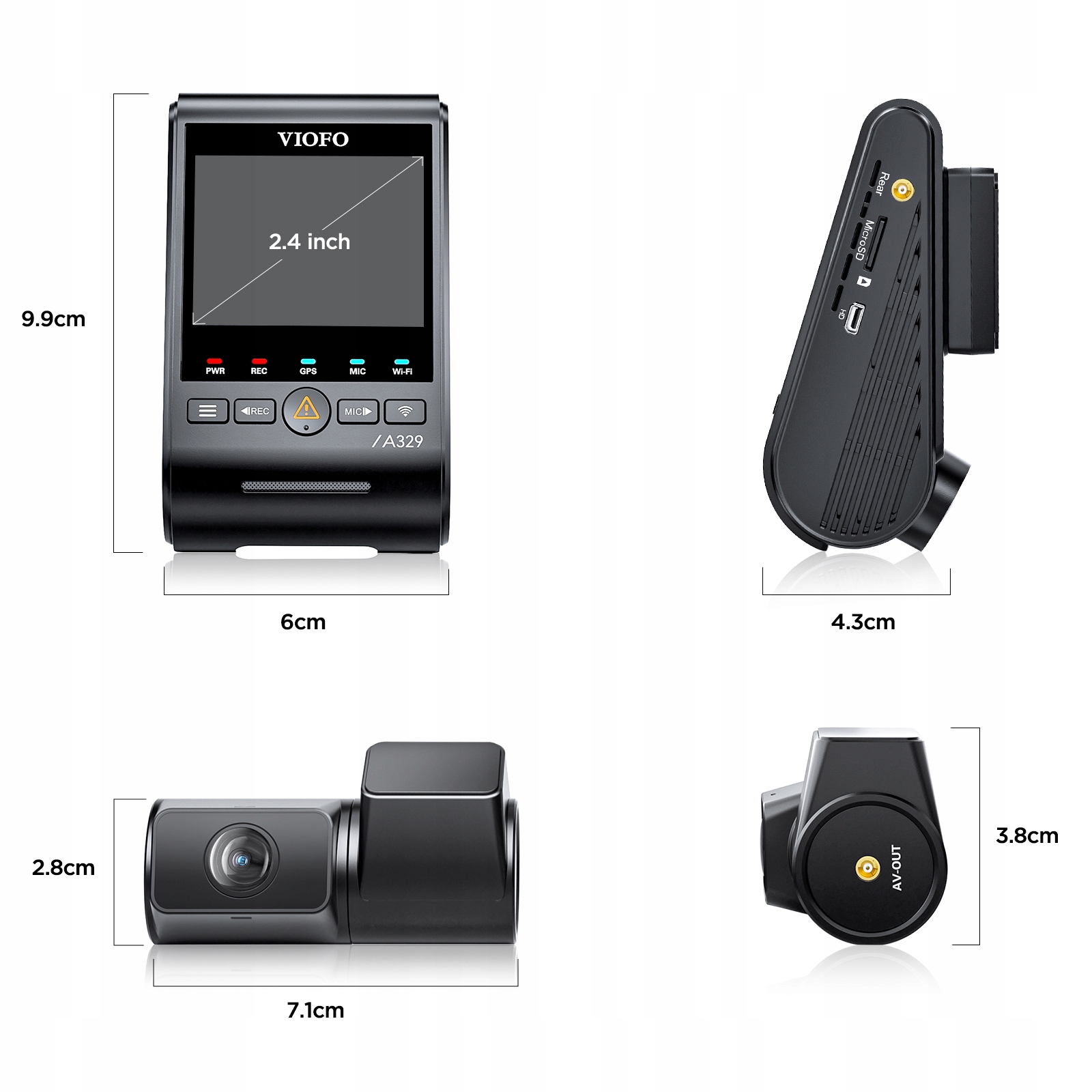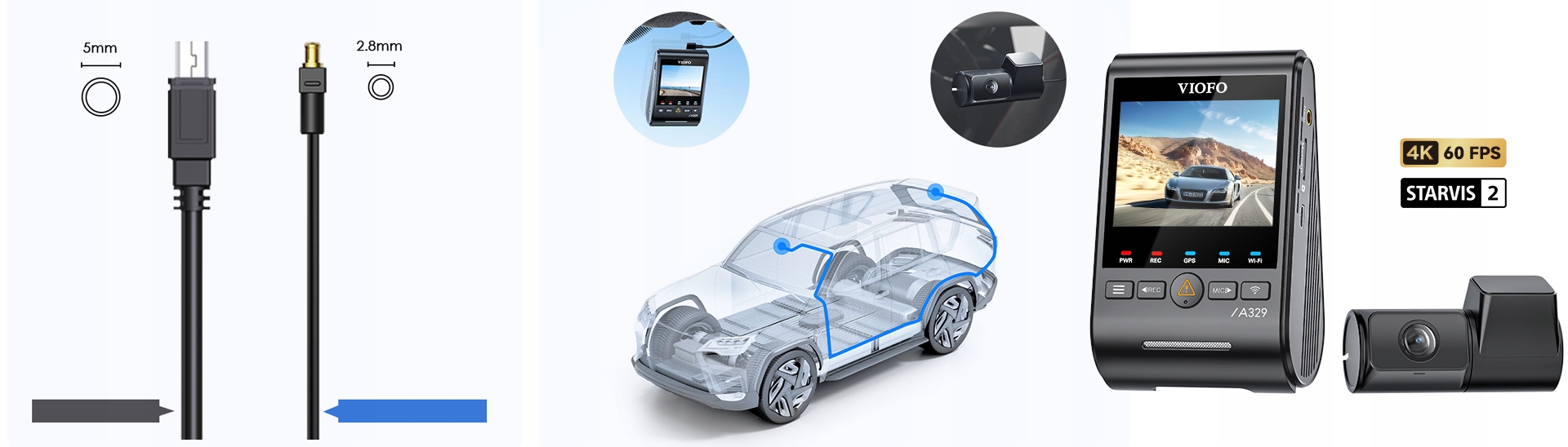 VIOFO A329 PRO posiada dyskretny główny moduł z wyświetlaczem, który pełni jednocześnie funkcję przedniej kamery. W module mamy wbudowany GPS oraz WIFI 6 działające do 3 razy szybciej. Do głównej części zestawu wpinamy kamerę na tył.