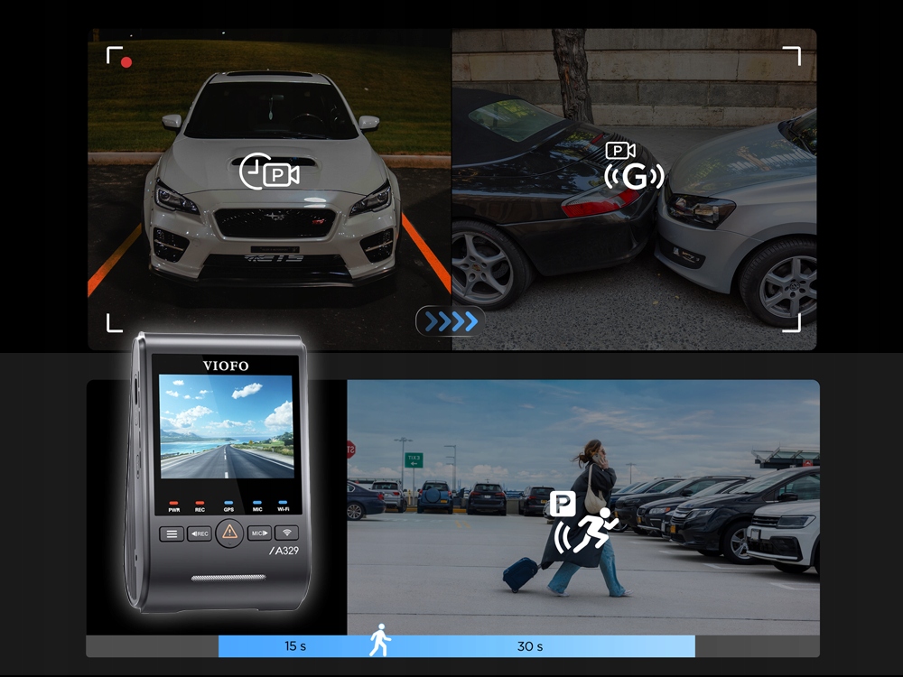 Marka VIOFO wprowadziła do serii A329 innowacyjny hybrydowy tryb parkingowy. Aby z niego korzystać, należy podłączyć kamerę na stałe do zasilania poprzez adapter HK6. Tryb hybrydowy zużywa minimalną ilość energii, co chroni akumulator przed rozładowaniem. Po wykryciu uderzenia urządzenie wybudza się w około 2 sekundy i rejestruje materiał dowodowy. Użytkownik ma do wyboru kilka trybów pracy na postoju:
