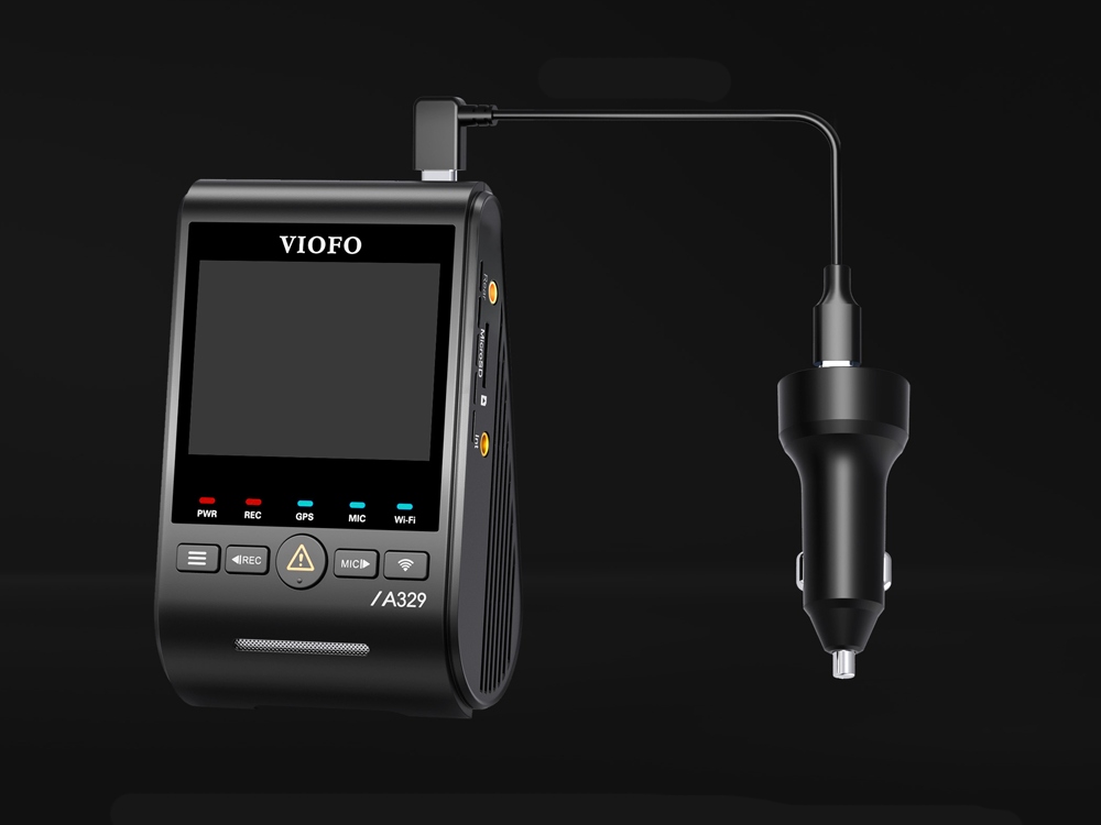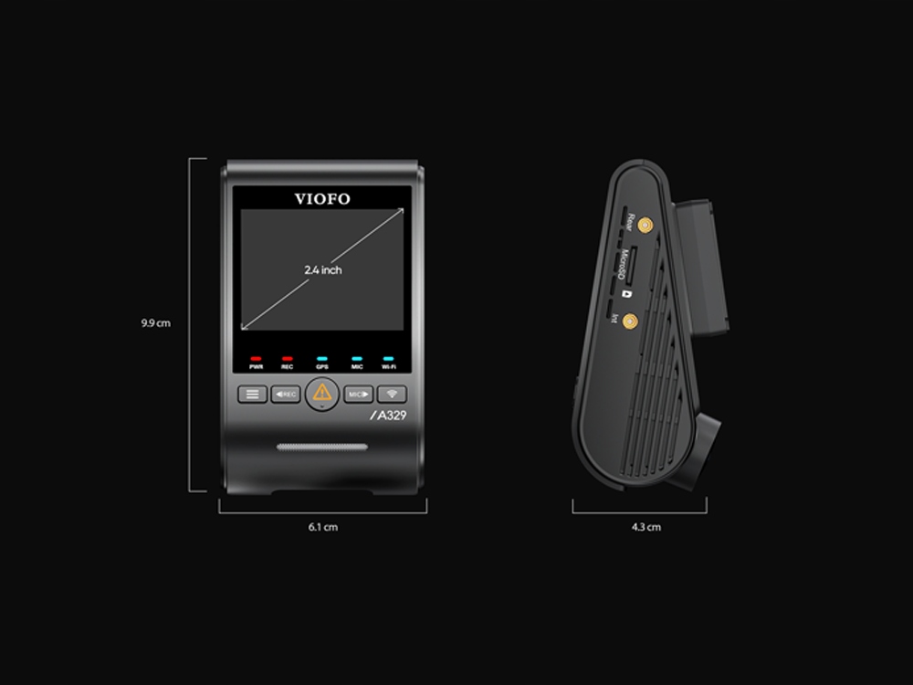 VIOFO A329S posiada dyskretny główny moduł z wyświetlaczem, który pełni jednocześnie funkcję przedniej kamery. W module mamy wbudowany GPS oraz WIFI 6 działające do 3 razy szybciej. Do głównej części zestawu wpinamy kamerę na tył.