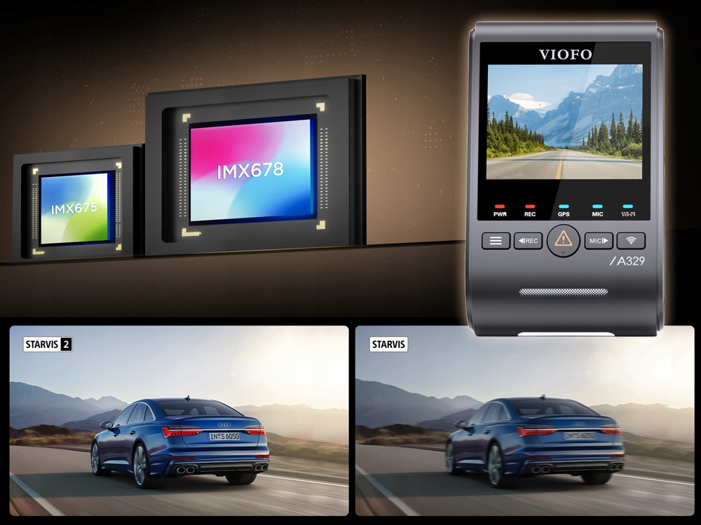 VIOFO A329S zostało wyposażone w matryce SONY STARVIS 2 w każdej z kamer. Przód to najnowszy model SONY IMX678, kamera do wewnątrz oraz tył to SONY IMX675.