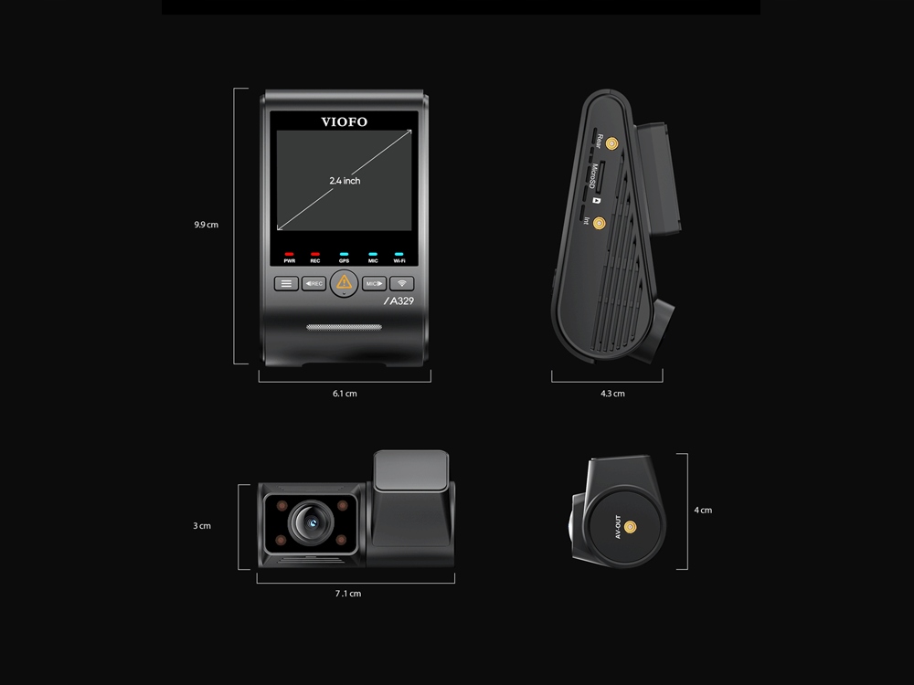 VIOFO A329S posiada dyskretny główny moduł z wyświetlaczem, który pełni jednocześnie funkcję przedniej kamery. W module mamy wbudowany GPS oraz WIFI 6 działające do 3 razy szybciej. Do głównej części zestawu wpinamy kamerę na tył.