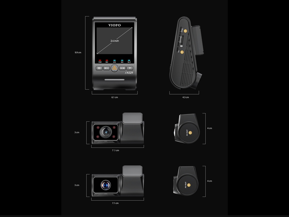 VIOFO A329S posiada dyskretny główny moduł z wyświetlaczem, który pełni jednocześnie funkcję przedniej kamery. W module mamy wbudowany GPS oraz WIFI 6 działające do 3 razy szybciej. Do głównej części zestawu wpinamy kamerę na tył.