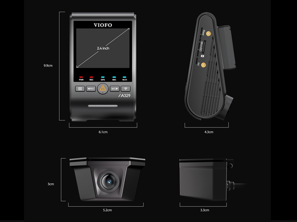 VIOFO A329S posiada dyskretny główny moduł z wyświetlaczem, który pełni jednocześnie funkcję przedniej kamery. W module mamy wbudowany GPS oraz WIFI 6 działające do 3 razy szybciej. Do głównej części zestawu wpinamy kamerę na tył.