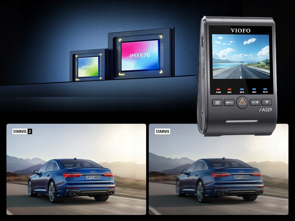 VIOFO A329S zostało wyposażone w matryce SONY STARVIS 2 w każdej z kamer. Przód to najnowszy model SONY IMX678, kamera do wewnątrz oraz tył to SONY IMX675.