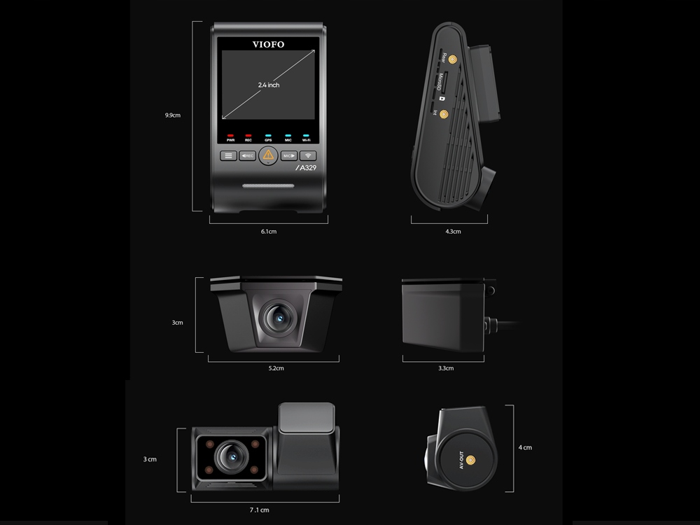 VIOFO A329S posiada dyskretny główny moduł z wyświetlaczem, który pełni jednocześnie funkcję przedniej kamery. W module mamy wbudowany GPS oraz WIFI 6 działające do 3 razy szybciej. Do głównej części zestawu wpinamy kamerę na tył.