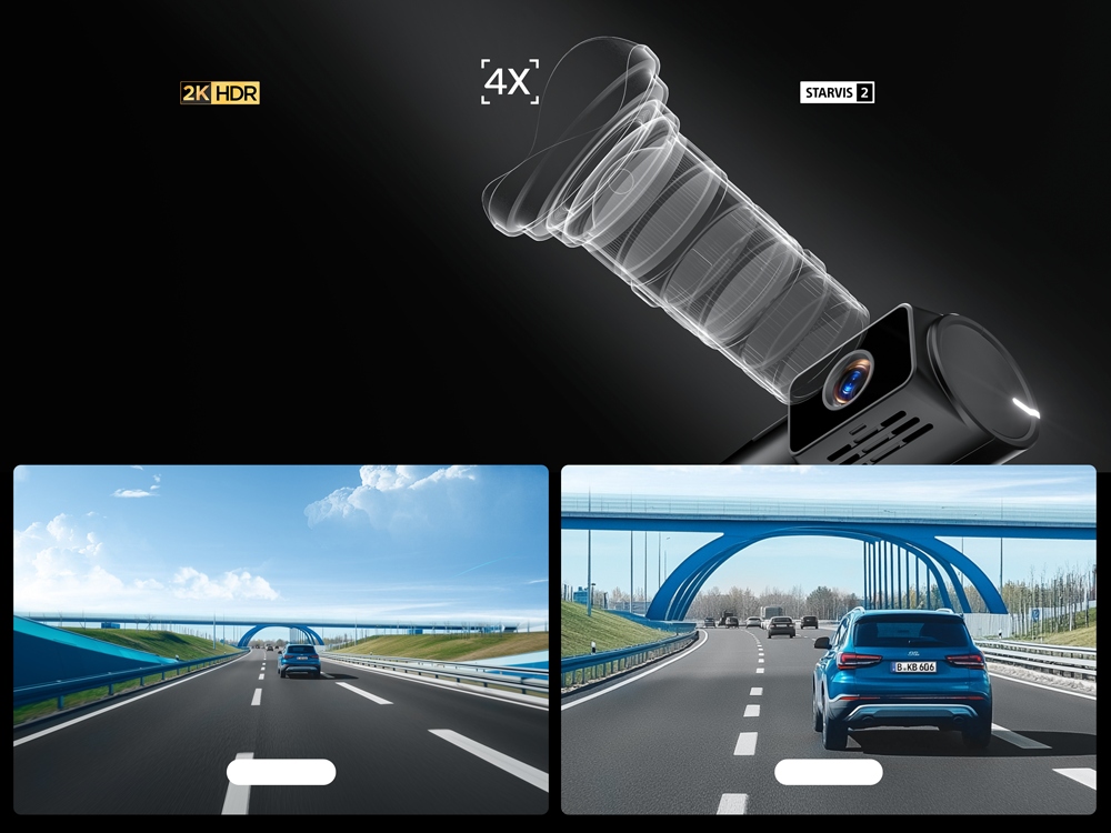 Seria A329T została wyposażona w dodatkową kamerę przednią z teleobiektywem, co czyni ją idealnym rozwiązaniem do rejestrowania detali i jeszcze skuteczniejszego odczytywania tablic rejestracyjnych pojazdów. Model VIOFO A329T 2CH oferuje 4-krotny zoom optyczny, umożliwiający precyzyjne uchwycenie odległych szczegółów na drodze, takich jak znaki drogowe czy numery rejestracyjne. Kamera z teleobiektywem nagrywa wyraźne filmy w jakości 2K bez zniekształceń, co pozwala błyskawicznie dzielić się zachwycającymi ujęciami z podróży.