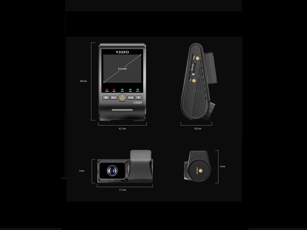 VIOFO A329T posiada dyskretny główny moduł z wyświetlaczem, który pełni jednocześnie funkcję przedniej kamery. W module mamy wbudowany GPS oraz WIFI 6 działające do 3 razy szybciej. Do głównej części zestawu wpinamy kamerę na tył.