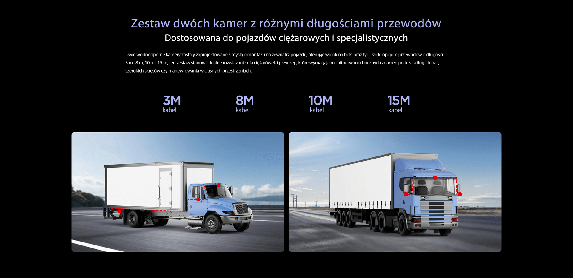 Dwie wodoodporne kamery są dedykowane do montażu na zewnątrz, zapewniając doskonałą widoczność z boku i z tyłu. Dzięki opcjom kabli o długościach 3 m, 8 m, 10 m i 15 m, zestaw ten jest idealny dla ciężarówek i naczep, ułatwiając rejestrację zdarzeń podczas szerokich zakrętów czy parkowania w ciasnych miejscach.