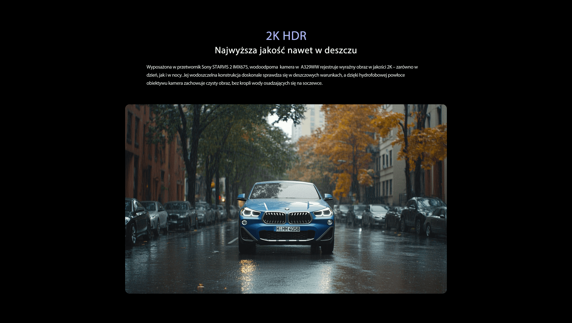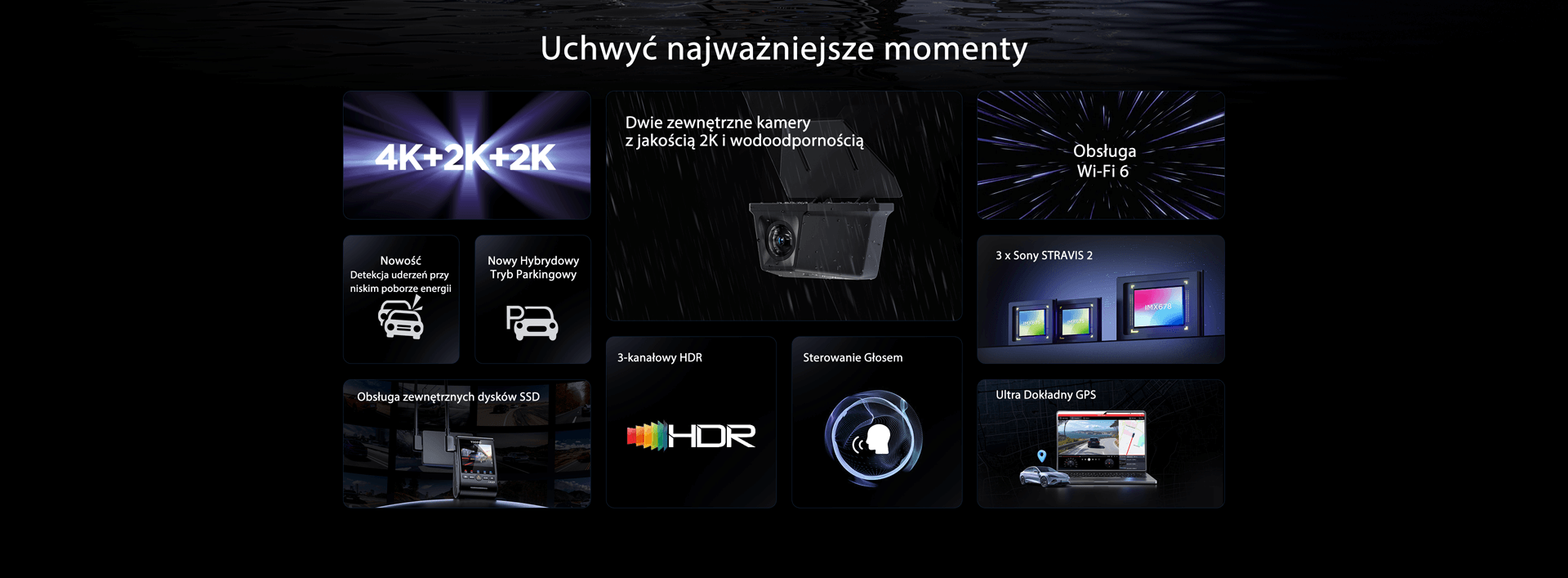Przednia kamera wykorzystuje matrycę SONY STARVIS 2 IMX678 (1/1.8), co zapewnia krystaliczną jakość 4K i mniejsze szumy. Kamery zewnętrzne oparte na matrycy IMX675 charakteryzują się 2,5-krotnie szerszym zakresem dynamiki, rejestrując wyjątkowo ostre filmy 2K.
