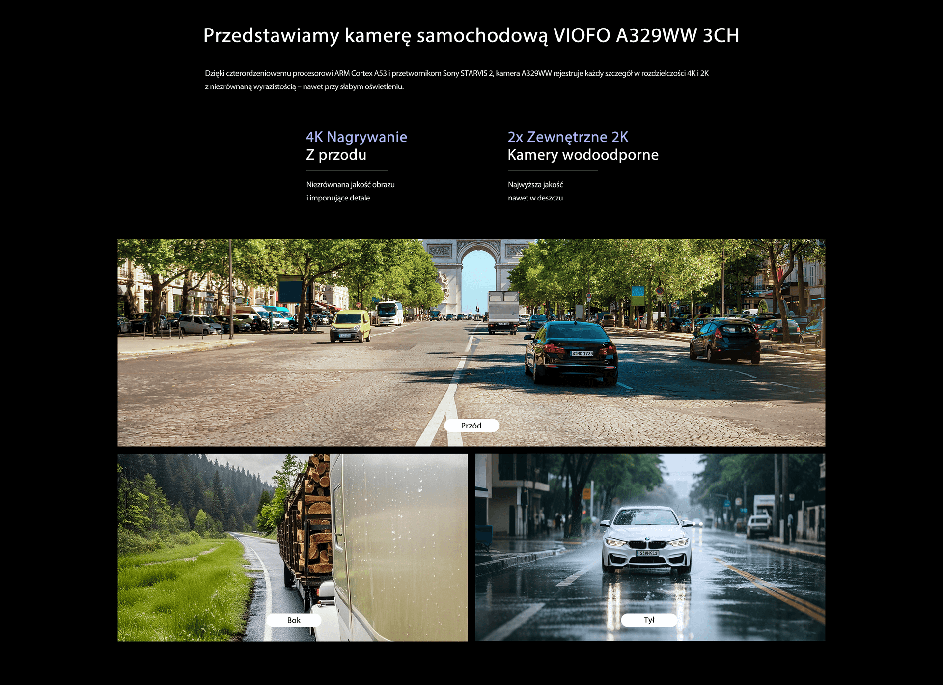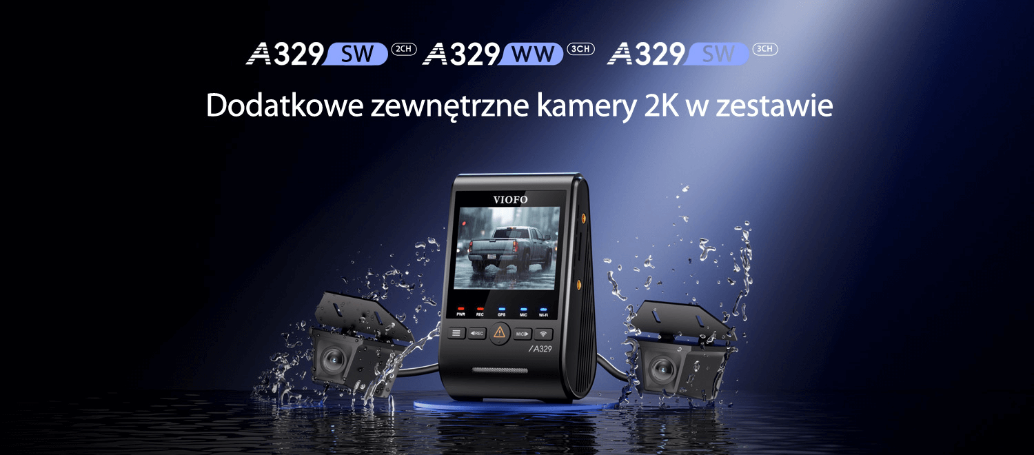Seria A329WW została wyposażona w dwie kamery zewnętrzne wodoodporne, co czyni ją najbardziej wszechstronnym systemem monitorowania dla wymagających pojazdów. Model VIOFO A329WW 3CH oferuje bezkompromisową jakość nagrań 4K HDR z przodu oraz dwukanałowy zapis 2K HDR z kamer zewnętrznych. To idealne rozwiązanie dla samochodów dostawczych i ciężarowych, zapewniające pełną ochronę boku i tyłu pojazdu w każdych warunkach pogodowych.