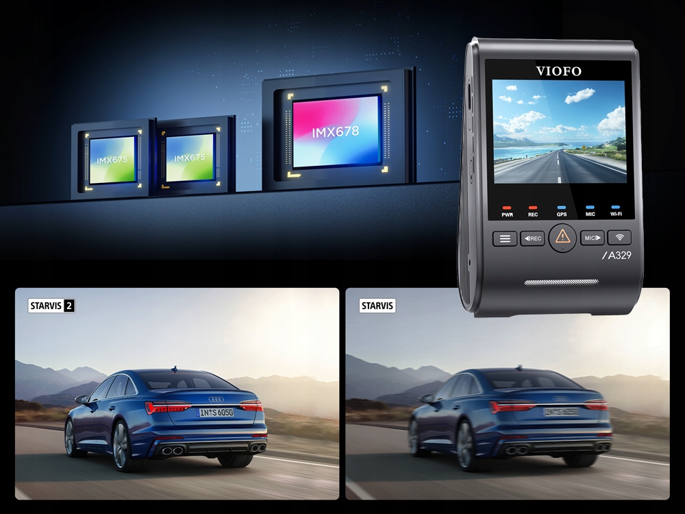 VIOFO A329WW zostało wyposażone w matryce SONY STARVIS 2 w każdej z kamer. Przód to najnowszy model SONY IMX678,pozostałe kamery to SONY IMX675.