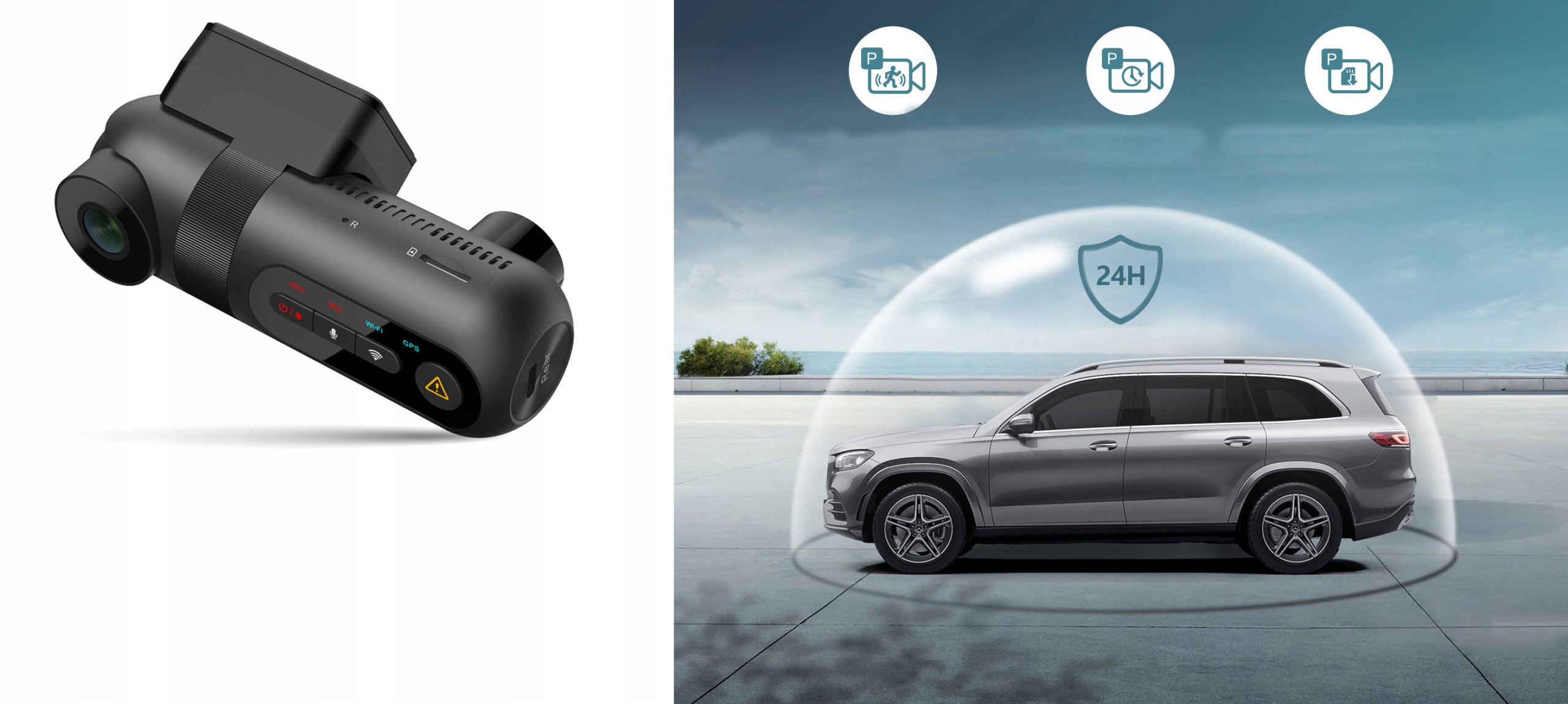 3. Niski bitrate (Low Bitrate): ciągłe nagrywanie z obniżoną przepływnością danych dla oszczędności miejsca. Tryb parkingowy zabezpiecza pojazd zarówno z perspektywy przedniej kamery, jak i wewnętrznej.