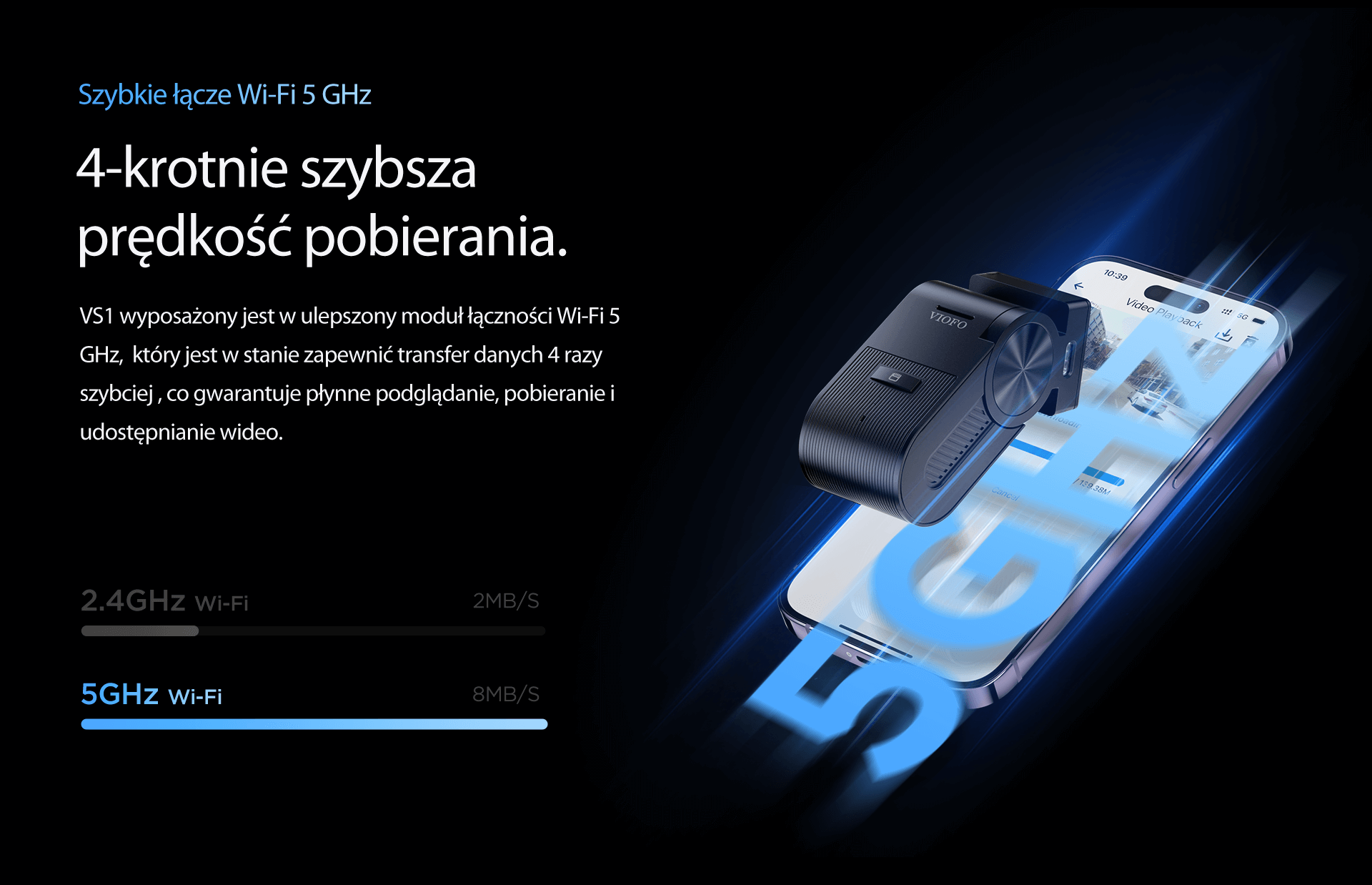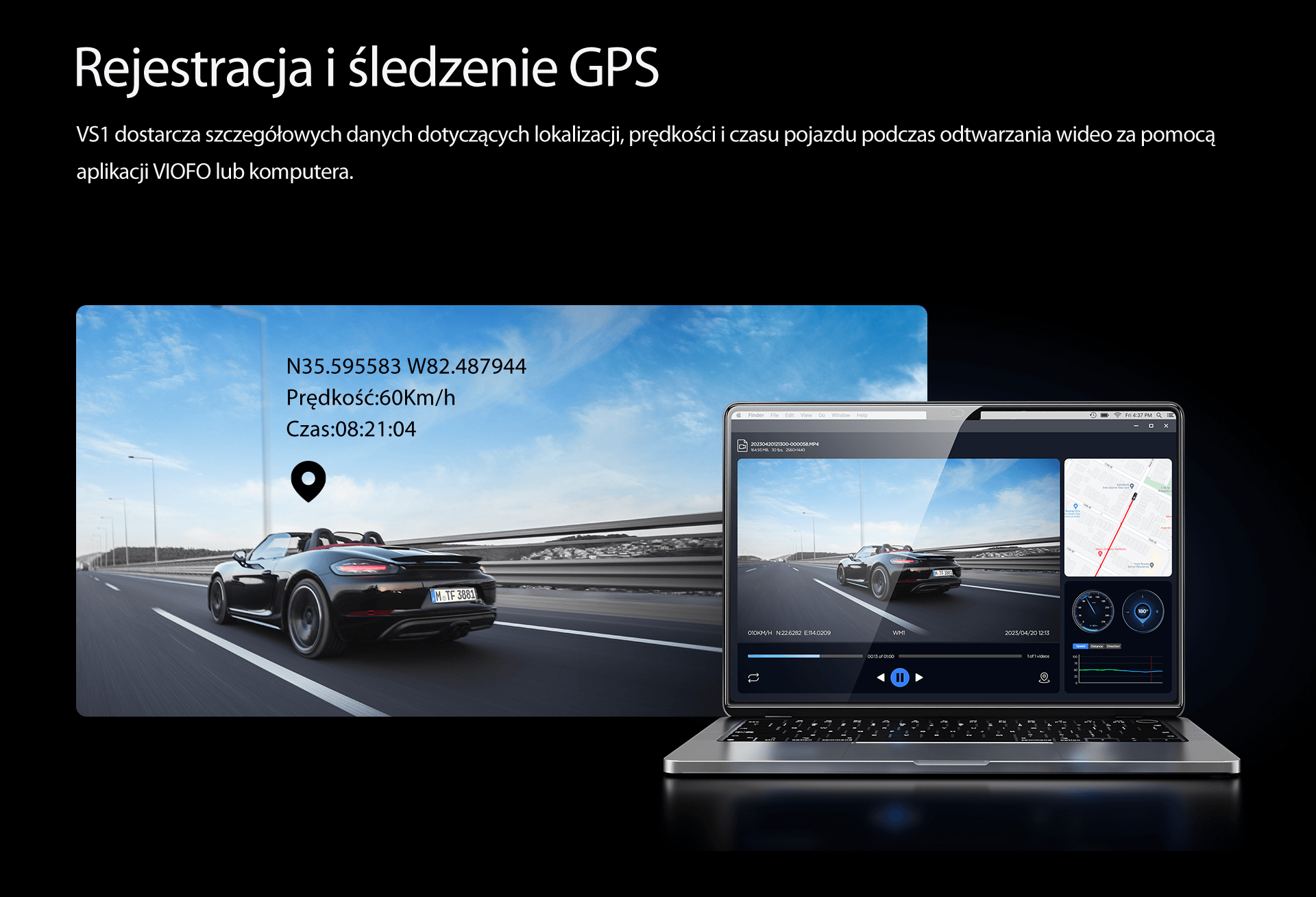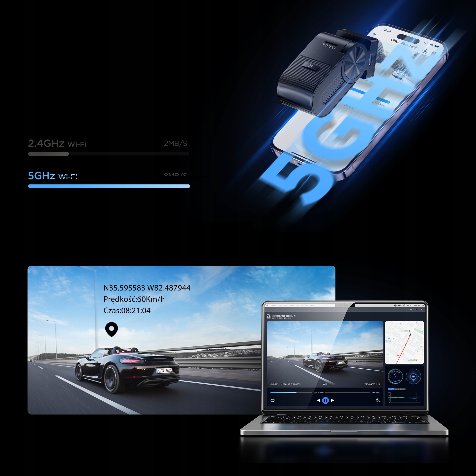 Wbudowany moduł WiFi obsługujący pasmo 5GHz zapewnia błyskawiczny transfer plików do darmowej aplikacji VIOFO na systemy Android oraz iOS. Pozwala to na szybkie pobranie dowodu z trasy bezpośrednio do pamięci telefonu. Zintegrowany moduł GPS dodaje do filmów informacje o prędkości oraz współrzędne geograficzne. Dane te mogą być odtwarzane w aplikacji lub programie DASHCAMVIEWER, umożliwiając śledzenie przejechanej trasy na mapie w sposób zsynchronizowany z wideo.