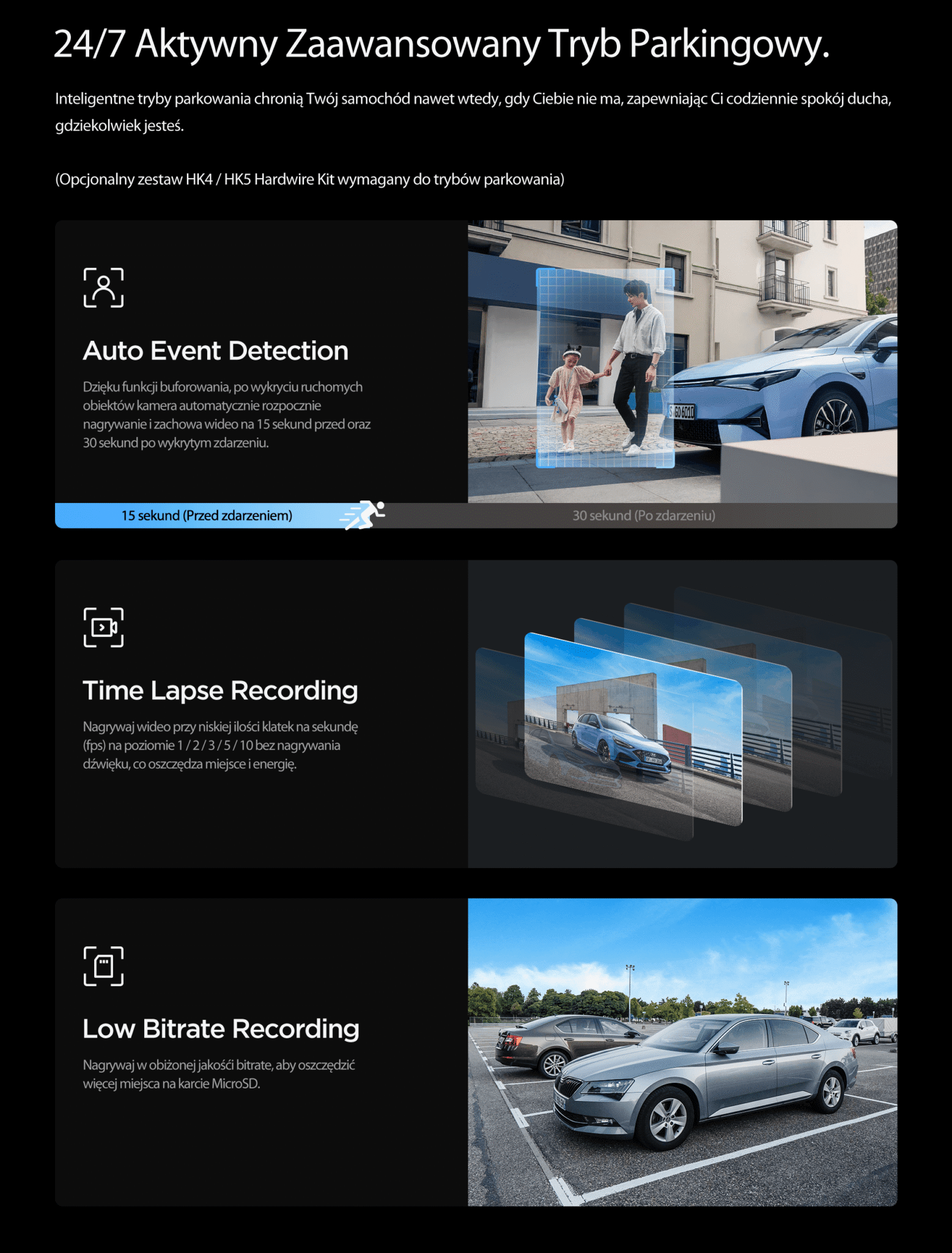 Tak, kamera posiada zaawansowany tryb parkingowy (w tym tryb buforowany, który zapisuje kilkanaście sekund przed zdarzeniem). Aby jednak tryb parkingowy działał prawidłowo i nie rozładował akumulatora w Twoim samochodzie, konieczne jest dokupienie i podłączenie adaptera zasilania (tzw. Hardwire Kit). Podpina się go bezpośrednio do skrzynki bezpieczników.