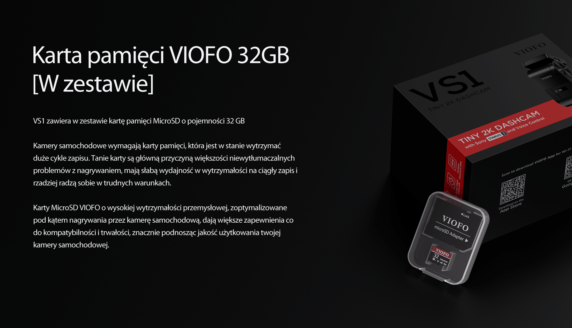Kamery VIOFO nagrywają obraz w bardzo wysokiej jakości i z wysokim „bitratem”, co mocno obciąża karty pamięci. Zwykłe karty (np. do smartfonów) bardzo szybko ulegną uszkodzeniu. Należy wybierać wyłącznie karty typu „High Endurance” lub „PRO Endurance” (np. VIOFO, SanDisk High Endurance, Samsung PRO Endurance), które są przystosowane do ciągłego zapisu nadpisującego.