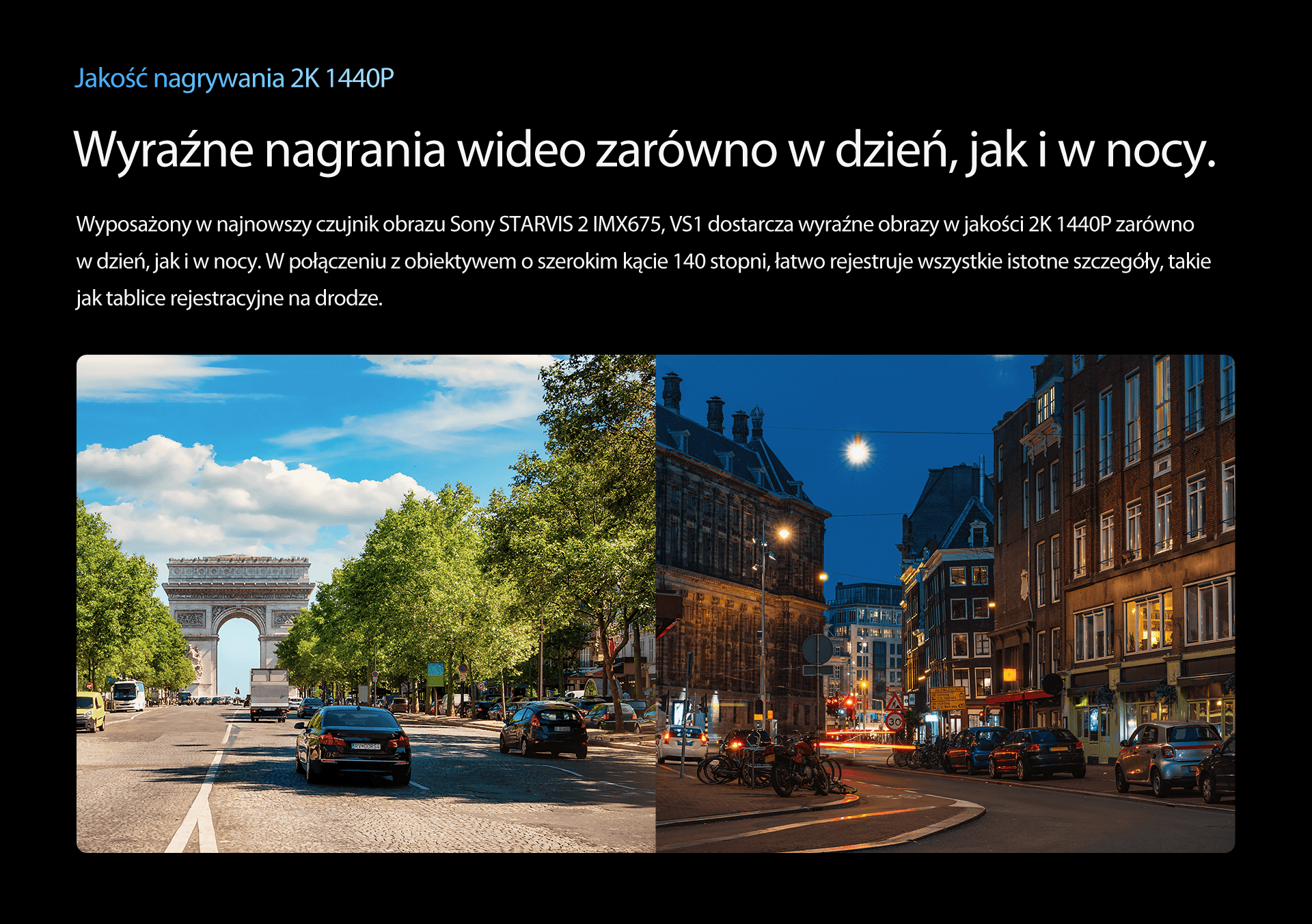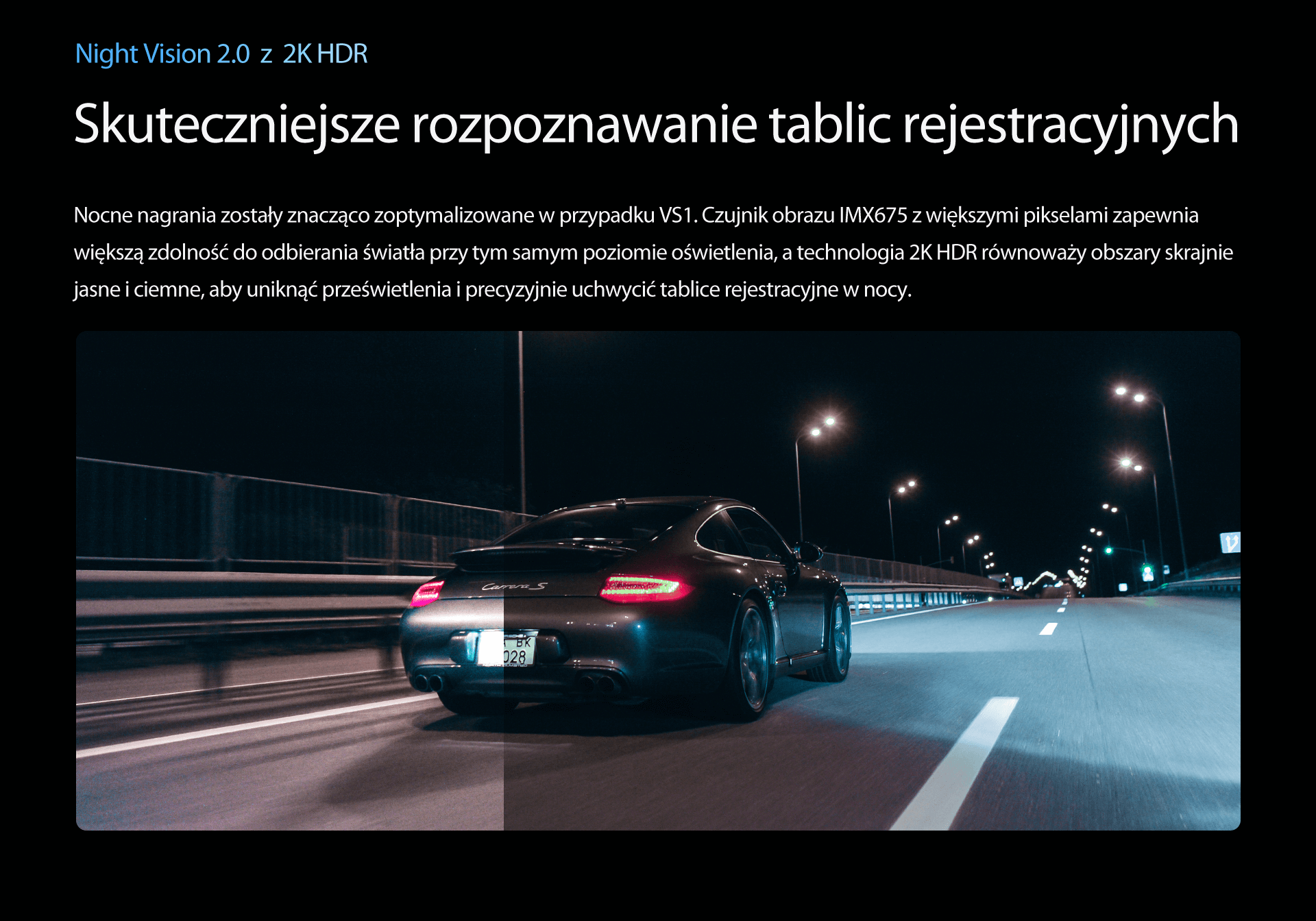 Wyposażona w najnowszy czujnik obrazu Sony STARVIS 2 IMX675, kamera samochodowa VS1 dostarcza krystalicznie czysty obraz w jakości 2K 1440P niezależnie od pory dnia. Nowoczesny sensor oferuje znacznie szerszy zakres dynamiczny, co przekłada się na drastyczną redukcję szumów oraz rozmycia ruchu. Technologia 2K HDR precyzyjnie równoważy obszary skrajnie jasne i ciemne, co pozwala uniknąć efektu oślepienia przez nadjeżdżające pojazdy i ułatwia odczytanie numerów rejestracyjnych po zmroku.