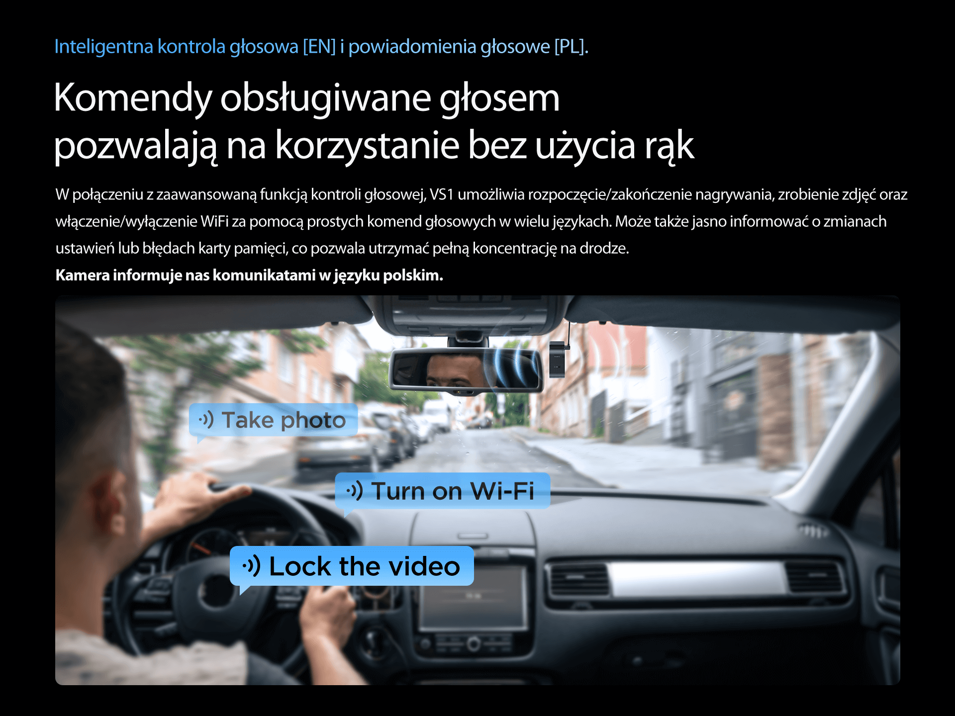 Rejestrator VS1 wspiera inteligentne sterowanie głosowe. Za pomocą prostych poleceń w języku angielskim (np. „Take Photo”, „Lock the Video”) możesz zarządzać urządzeniem bez odrywania rąk od kierownicy. Dodatkowo, kamera samochodowa VS1 została zaprogramowana tak, aby informować o statusie swojej pracy (np. rozpoczęcie nagrywania, błąd karty pamięci) poprzez jasne komunikaty głosowe w języku polskim, co znacząco podnosi komfort użytkowania.