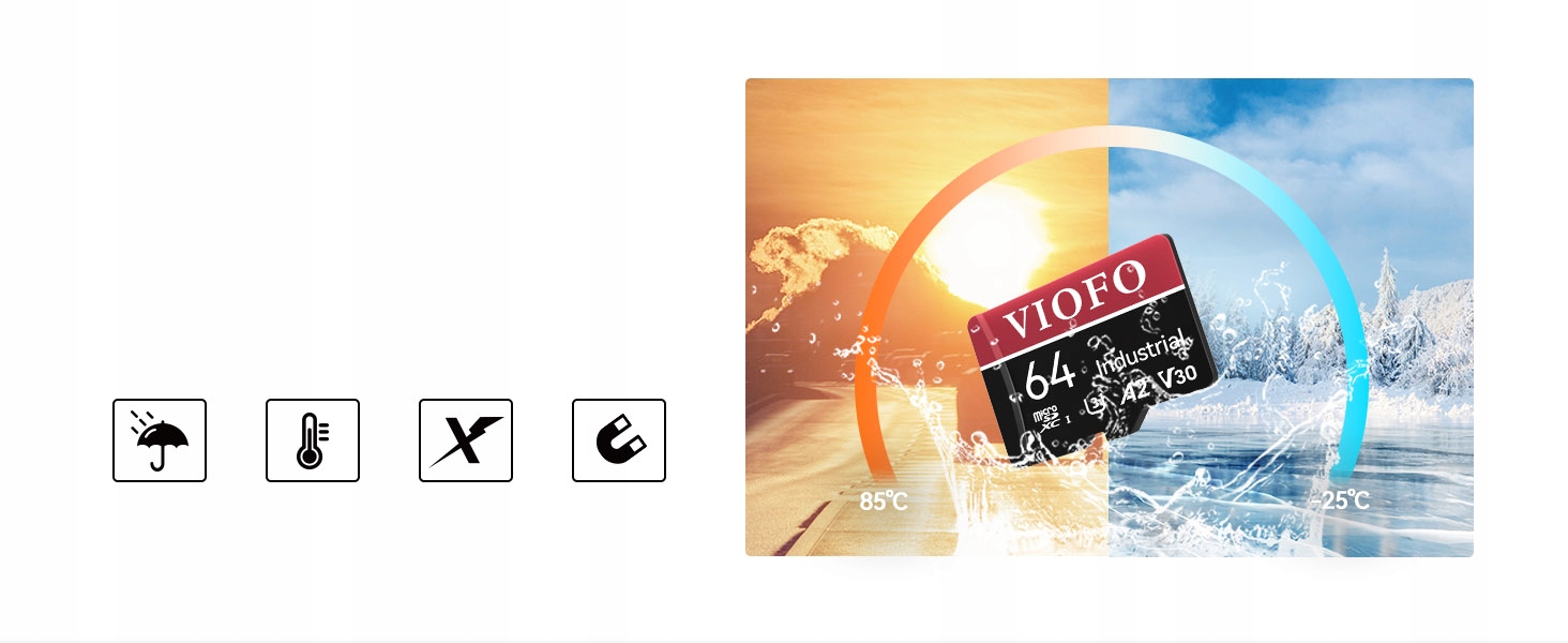 Kamery VIOFO nagrywają obraz w bardzo wysokiej jakości i z wysokim „bitratem”, co mocno obciąża karty pamięci. Zwykłe karty (np. do smartfonów) bardzo szybko ulegną uszkodzeniu. Należy wybierać wyłącznie karty typu „High Endurance” lub „PRO Endurance” (np. VIOFO, SanDisk High Endurance, Samsung PRO Endurance), które są przystosowane do ciągłego zapisu nadpisującego.