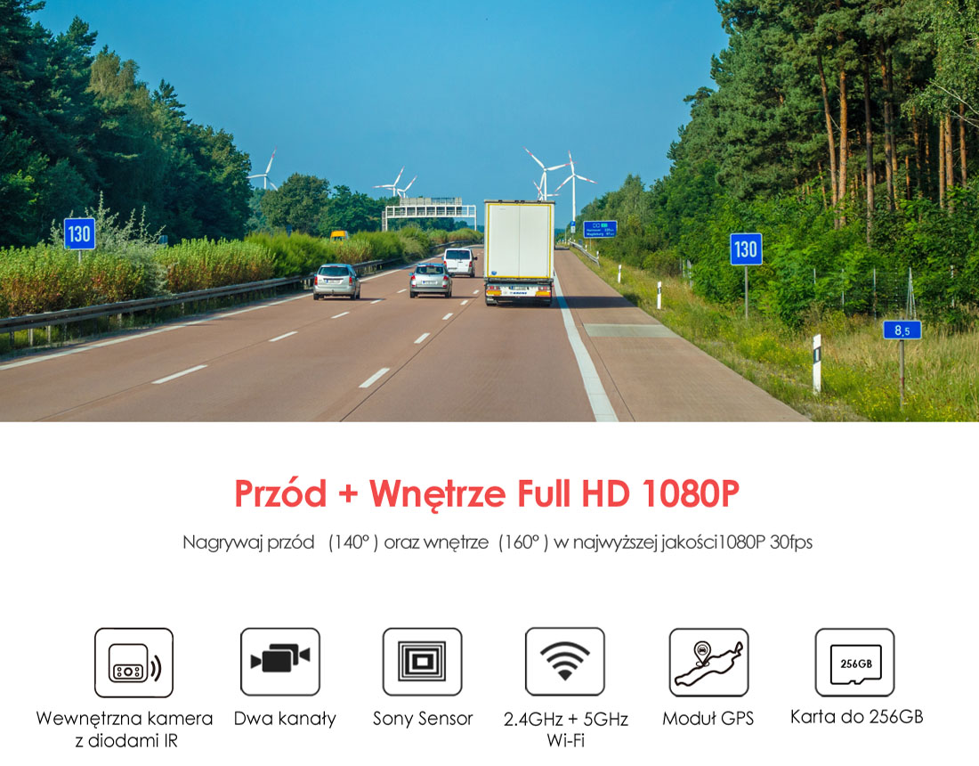 Najwyższa jakość nagrań FHD 30fps przód + wnętrze