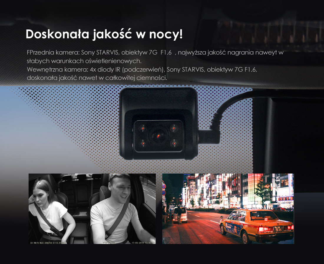 Kamera Viofo A129 DUO GPS IR jako unikalna kamera samochodowa została wyposażona w 2x matrycę SONY STARVIS IMX291 i obiektyw o jasności F1.6 z przodu i z tyłu – takie rozwiązanie pozwala na "tryb noktowizji" w całkowitej ciemności. Dodatkowa kamera posiada wbudowane diody IR (podczerwień), które pozwalają nagrywać wnętrze pojazdu nawet w całkowitej ciemności!