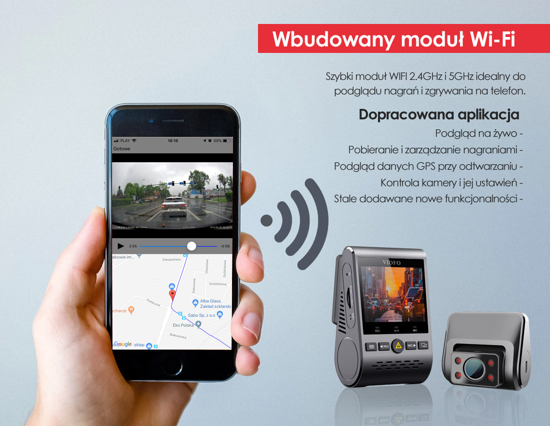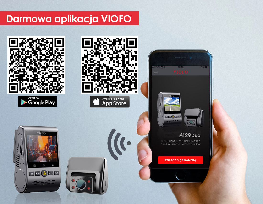 VIOFO A129-G DUO posiada wbudowany zaawansowany moduł WIFI pracujący w pasmach 2.4Ghz oraz 5Ghz. Sterowanie kamerą może być realizowane np. ze smartfona dzięki darmowej aplikacji iOS/Android o nazwie VIOFO. Dodatkowo kamera posiada moduł Bluetooth, do którego będzie można sparować przycisk "zabezpiecz nagranie" (przycisk dostępny w połowie lipca 2018).