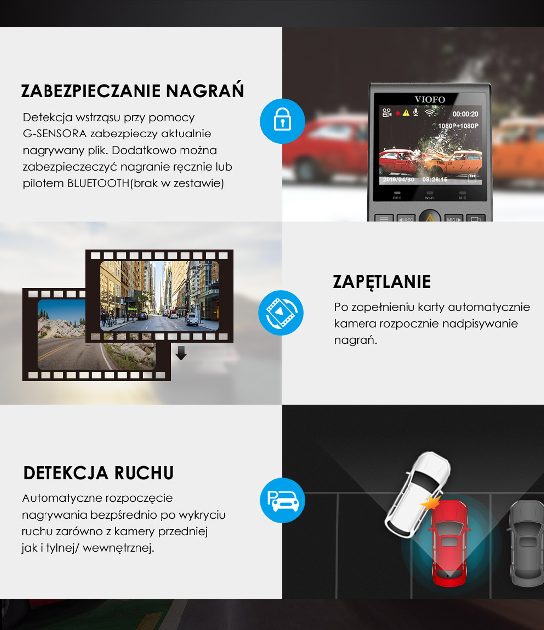 Detekcja ruchu, automatyczny start po podaniu zasilania i wyłączenie, G-sensor, zapętlanie, znacznik daty i godziny, rejestracji, dodatkowej treści na nagraniu.